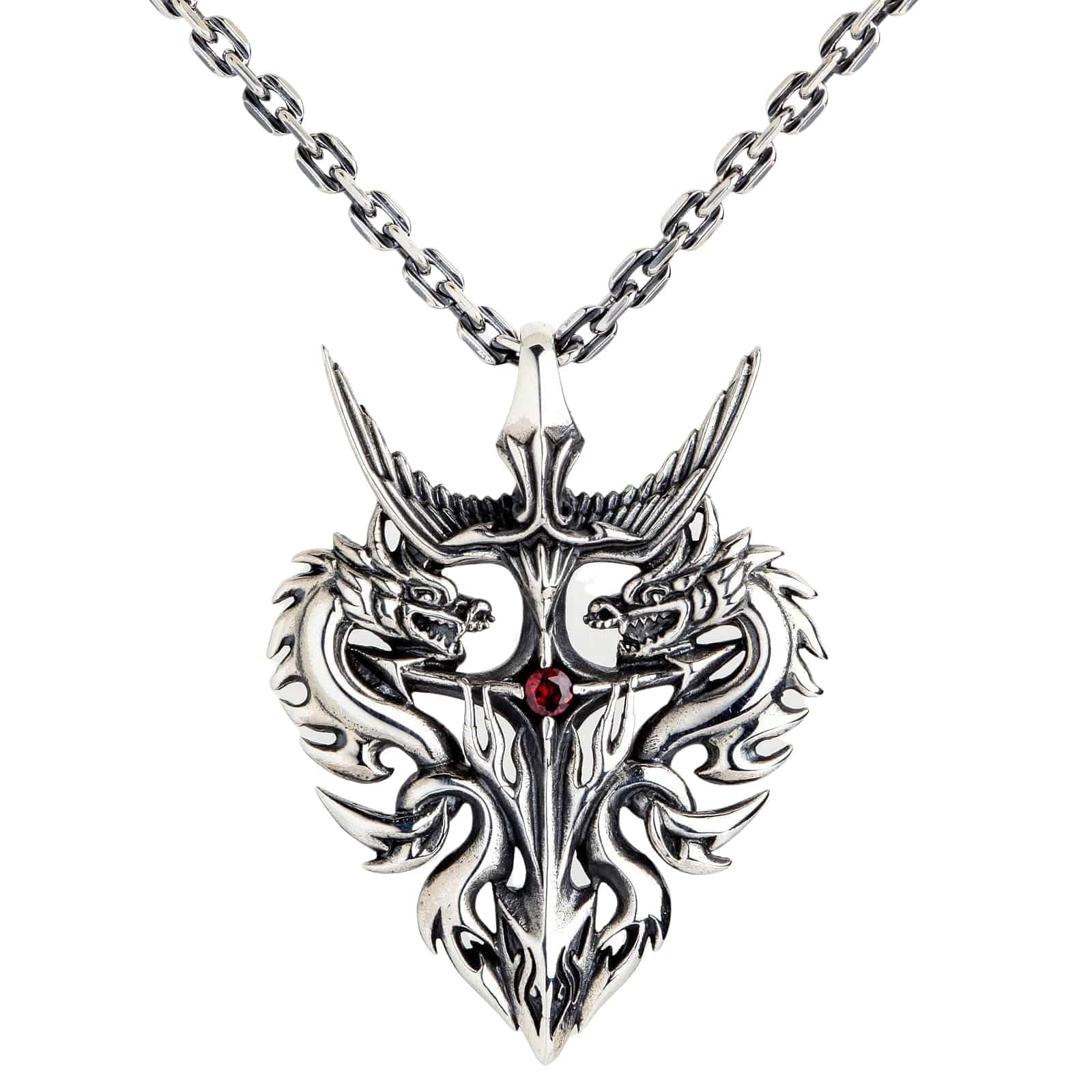 Acest pandantiv este realizat în stilul unui blazon heraldic puternic. Are doi dragoni gemeni, perfect oglindiți față în față. Acest design simetric este un simbol profund al dualității și echilibrului—armonia dintre forțele opuse. Dragonii sunt încadrați de aripi ascuțite și un motiv de flacără învolburată, conferind întregii piese o energie gotică dinamică și agresivă.