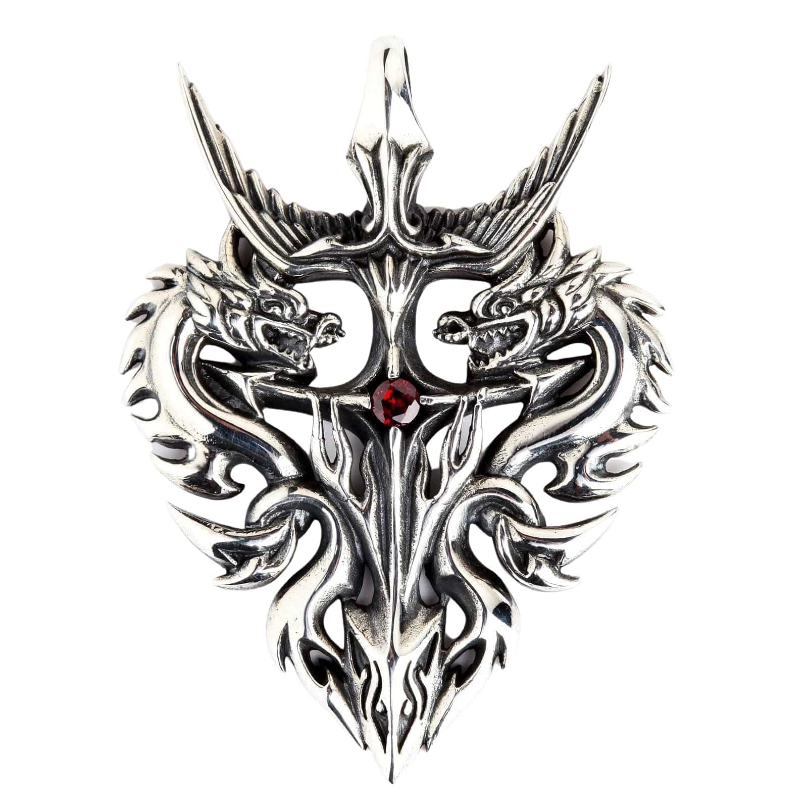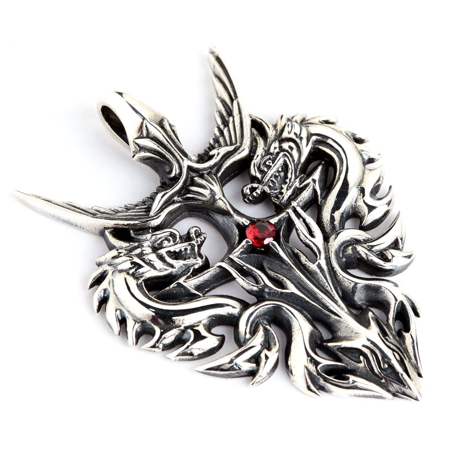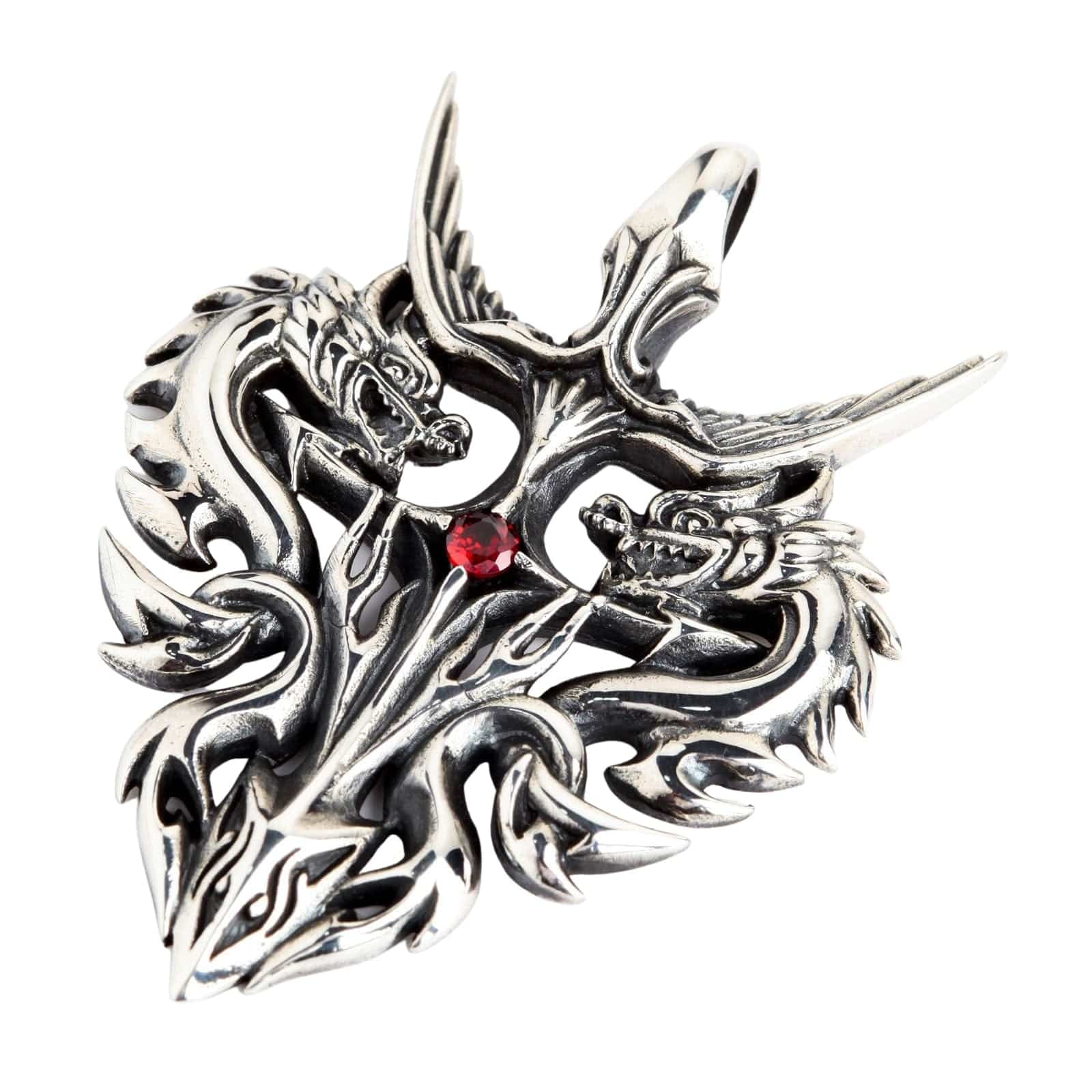 Pandantiv din argint masiv cu doi dragoni gardieni și granat