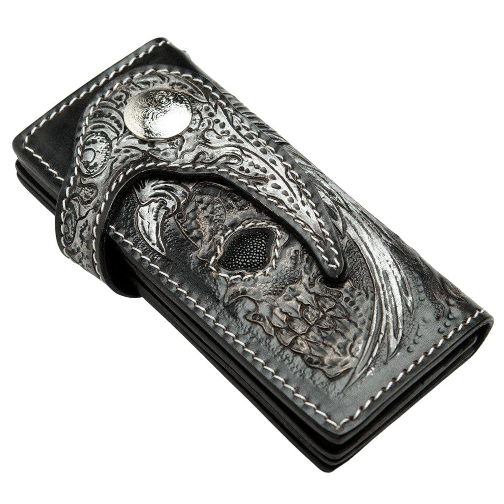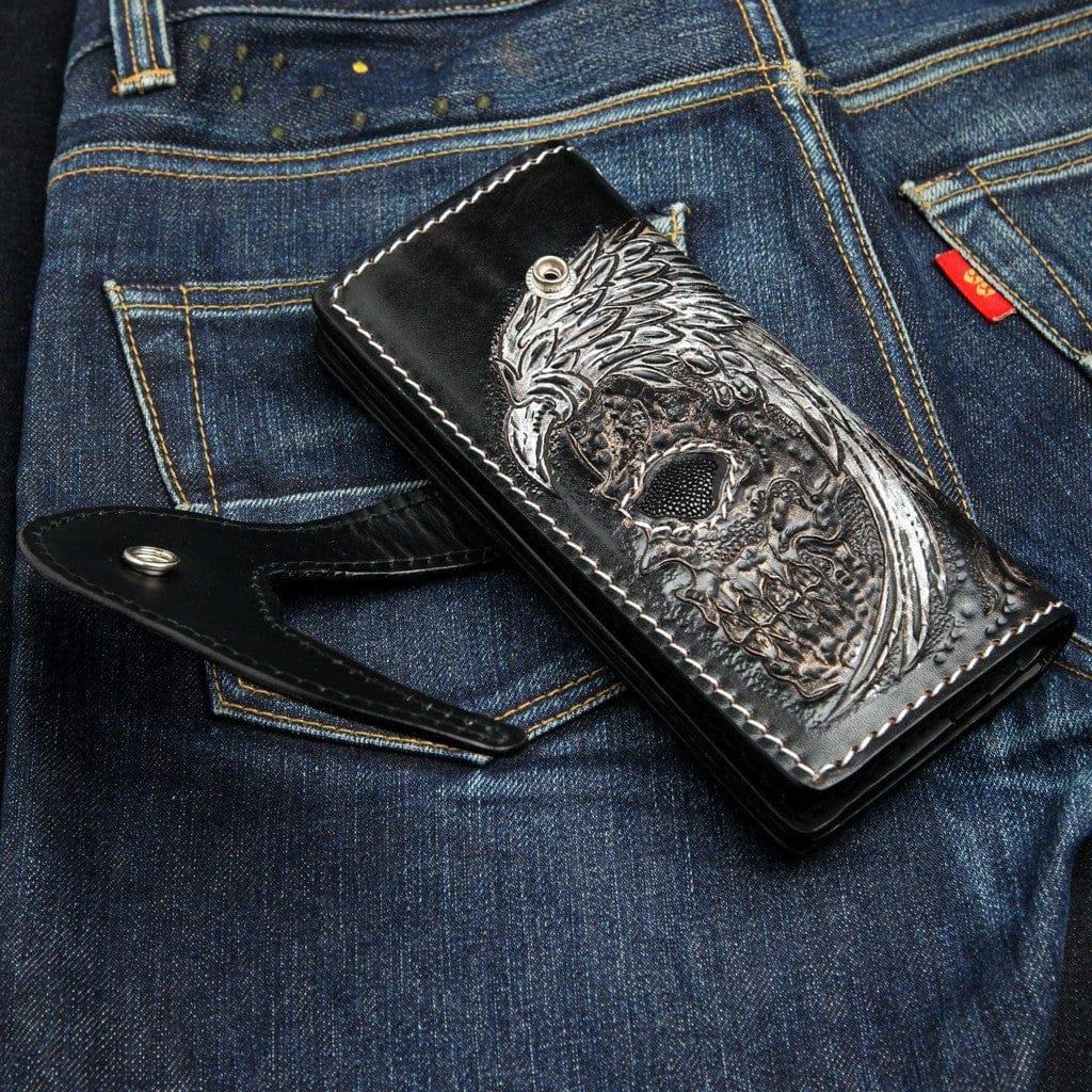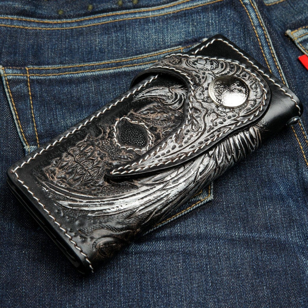 Portofel biker sculptat manual cu craniu înaripat din piele și pisică de mare