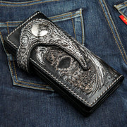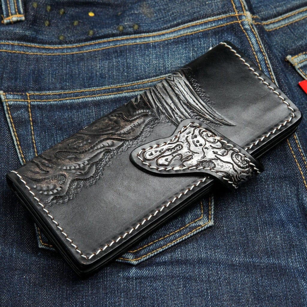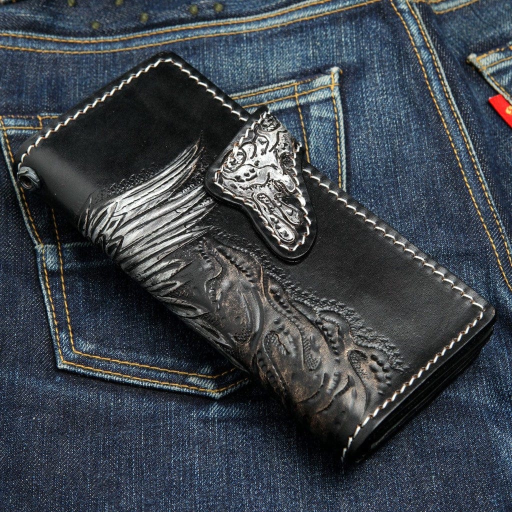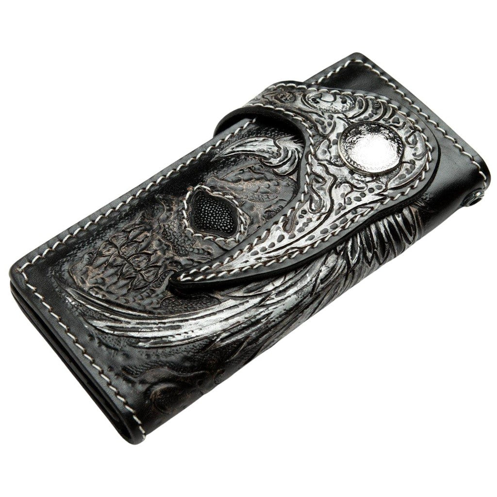 Portofel biker sculptat manual cu craniu înaripat din piele și pisică de mare