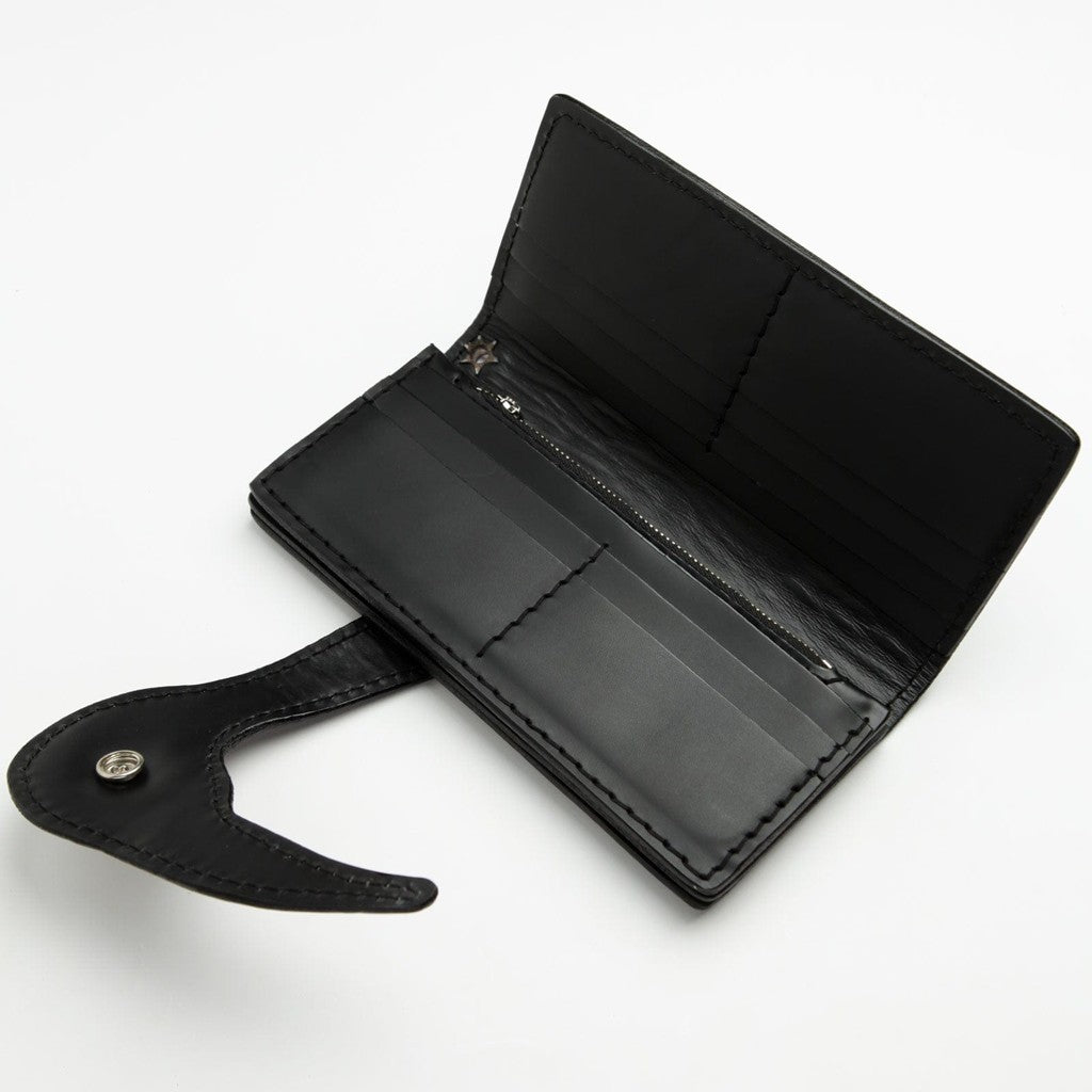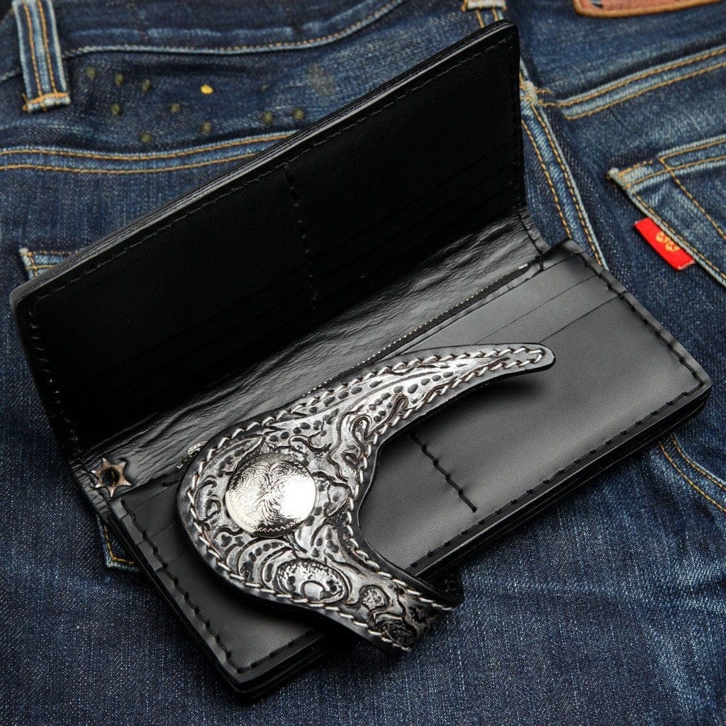 Sufletul acestui portofel constă în spectaculosul lucru manual în piele sculptată. Un artizan a sculptat cu grijă un craniu înaripat impunător în pielea de vacă premium, simbol atemporal al libertății și al spiritului neînfricat al motociclistului. Pentru un plus de rafinament, fața craniului este realizată dintr-un inlay de piele autentică de pisică de mare neagră, textura sa unică, asemănătoare caviarului, creând un punct focal spectaculos. Portofelul este securizat cu un concho mare și ornamentat din argint sterling și dispune de un ocol solid pentru lanțul portofelului. În interior, un format trifold spațios se deschide pentru a dezvălui o capacitate impresionantă: zece sloturi pentru carduri, trei compartimente pentru bancnote și un buzunar cu fermoar pe toată lungimea pentru siguranță maximă pe drum.