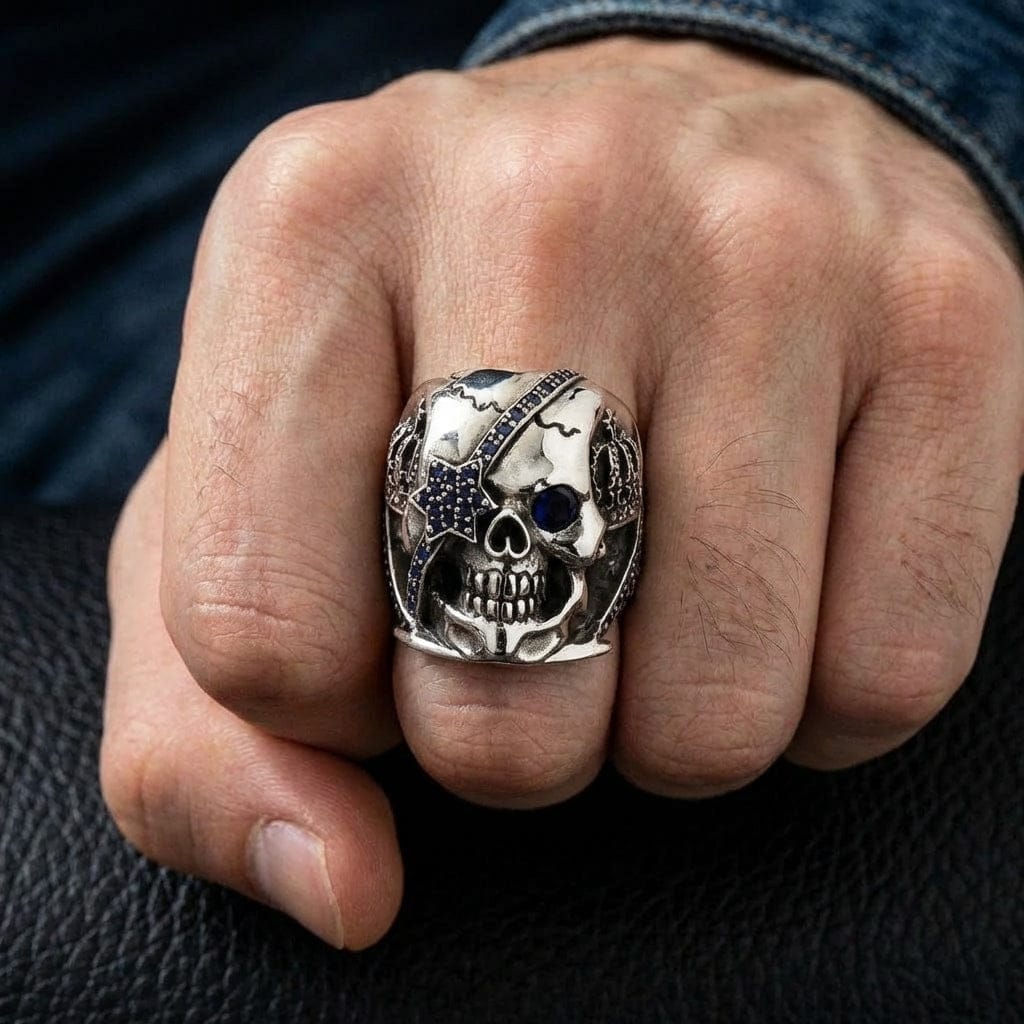 Увенчанный короной череп с одной стороны украшен повязкой на глаз с синими камнями кубического циркония в форме звезды, а с другой — глубоко посаженным сапфировым оком. Кольцо Crown Skull Ring with Blue Eye Patch от Bikerringshop сочетает в себе эстетику королевской власти, дух бунтарства и пиратскую символику, воплощенные в 32 граммах цельного серебра .925 пробы. Корона объемно охватывает череп, а ее острые зубцы настолько детализированы, что их можно ощутить на ощупь.