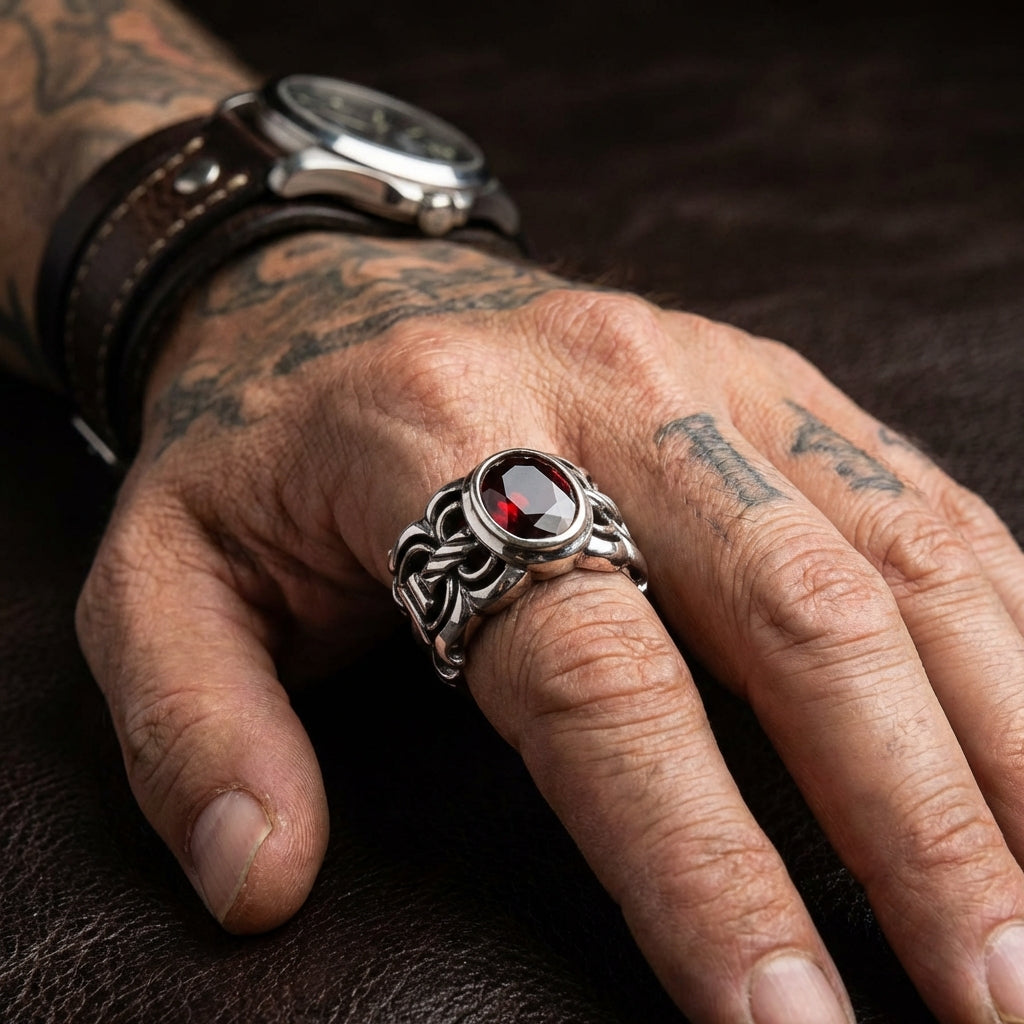1. Что символизирует кольцо-меч с красным камнем? Этот дизайн наполнен воинской символикой. Обод в форме рукояти меча означает силу, справедливость и рыцарский кодекс. Красный гранат исторически назывался «камнем воина» и символизировал защиту, отвагу и страсть. Вместе они создают мощный талисман благородного воина.