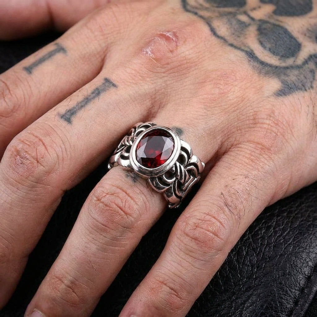 Истинное искусство этого кольца раскрывается в его уникальной конструкции. Сам ободок — это скульптура, мастерски выполненная так, чтобы напоминать изысканные гарды и рукояти средневековых мечей. Эти серебряные рукояти плавно поднимаются вверх, формируя каст, который надёжно удерживает великолепный центральный камень. В самом центре — крупный овальный сверкающий красный гранат (куб. цирконий). Исторически гранат считался «камнем воина», талисманом защиты, который часто вставляли в мечи королей и рыцарей. Его огненно-красный цвет — мощный символ смелости, страсти и жизненной силы. Это идеальное сочетание символики и дизайна, воплощённое в массивных 18 граммах чистого серебра, создаёт украшение, которое одновременно является сильным заявлением и данью эпохе чести.