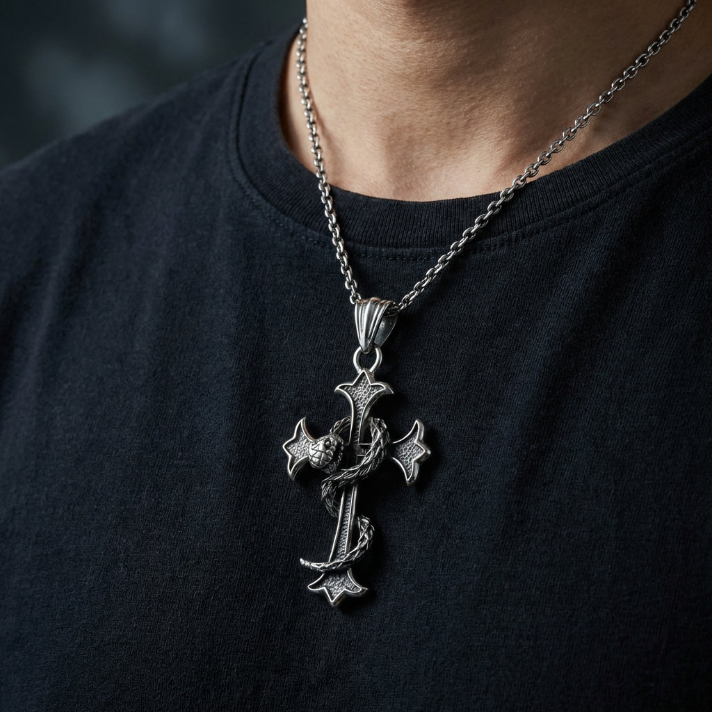Погрузитесь в глубокие тайны жизни и смерти с нашим выразительным готическим кулоном Крест со змеёй. Это не просто украшение — это мощный талисман, смелое утверждение дуализма, объединяющее два самых сильных символа в истории. Кулон, выкованный из цельного серебра, предназначен для мужчины, который понимает сложный баланс между светом и тьмой.
