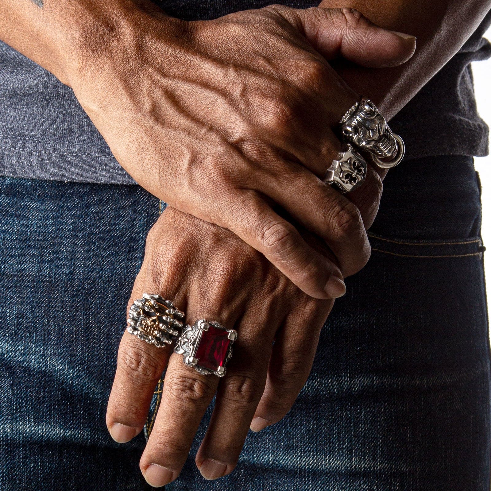 Это действительно массивное кольцо с красным камнем, весом 26 грамм, которое ощущается на руке мощно и сбалансированно. Контраст между отполированными серебряными когтями и грубой, текстурированной шинкой создаёт впечатляющую глубину, сразу привлекающую взгляд. Это готическое кольцо-дракон — не просто украшение: это талисман силы, повод для разговора и дань эпическим мифам и магии.