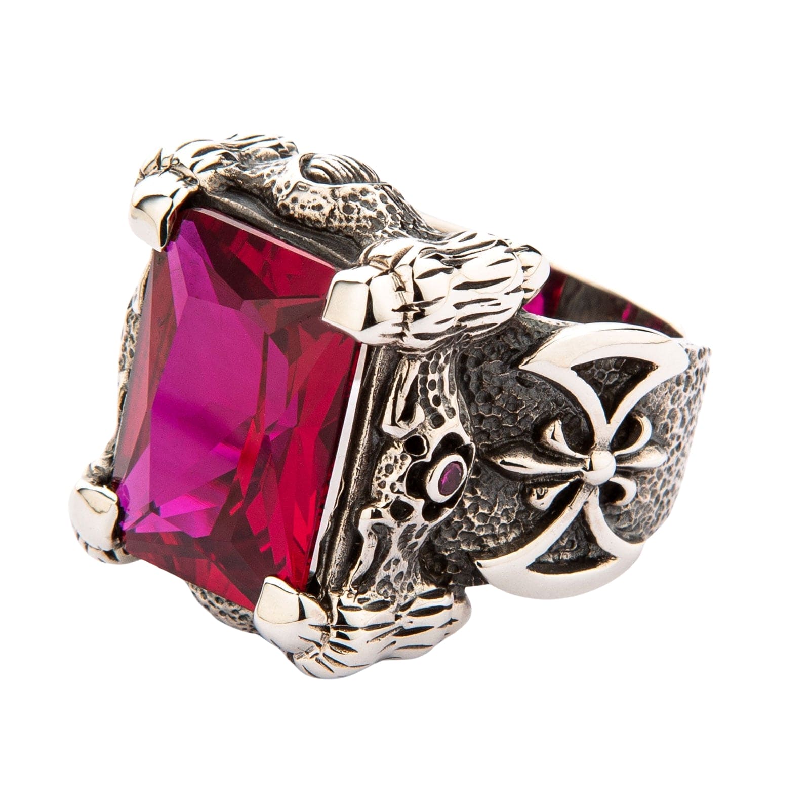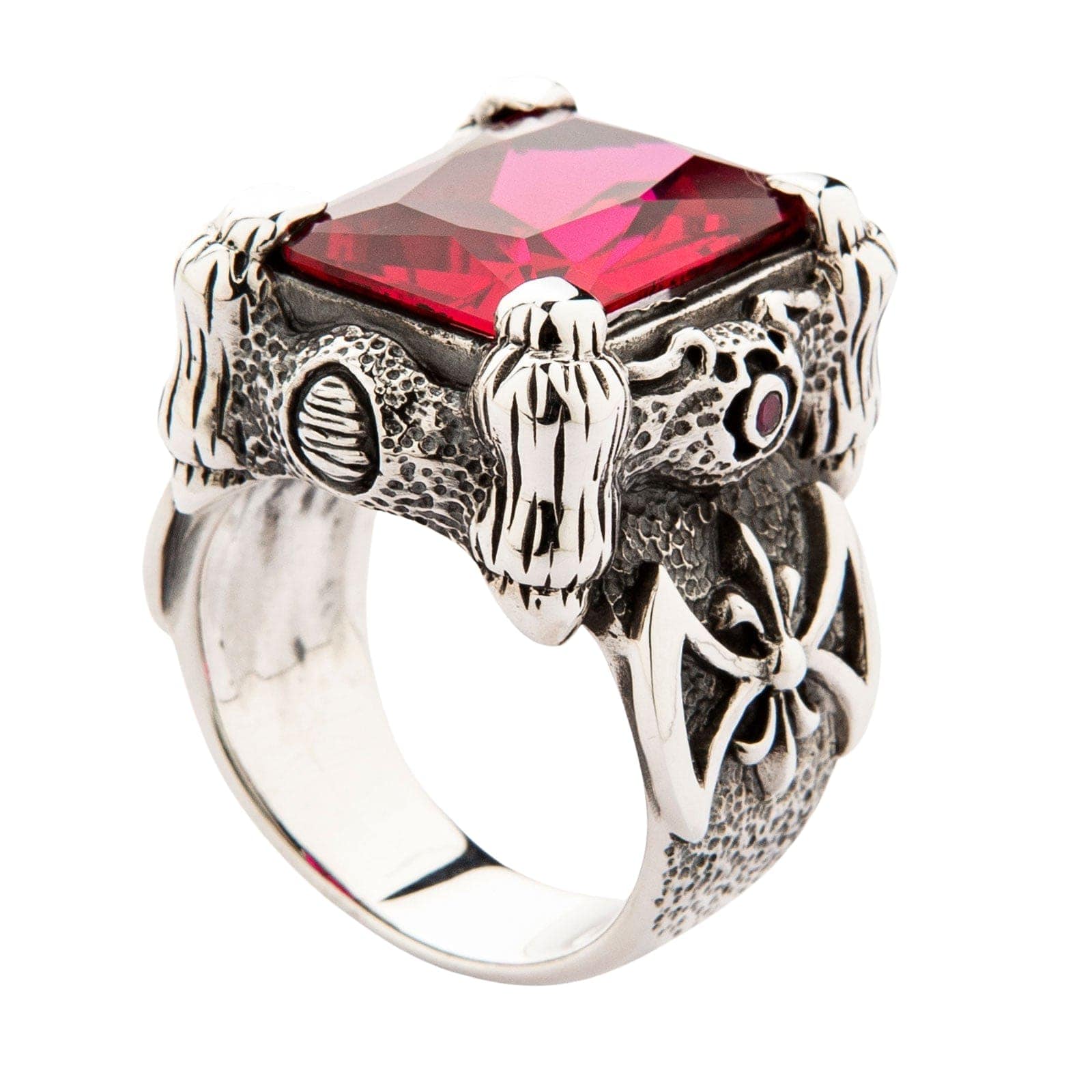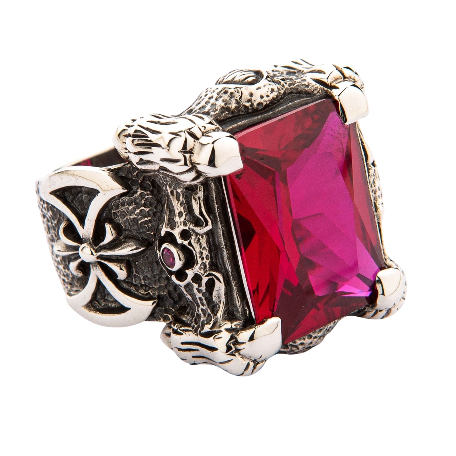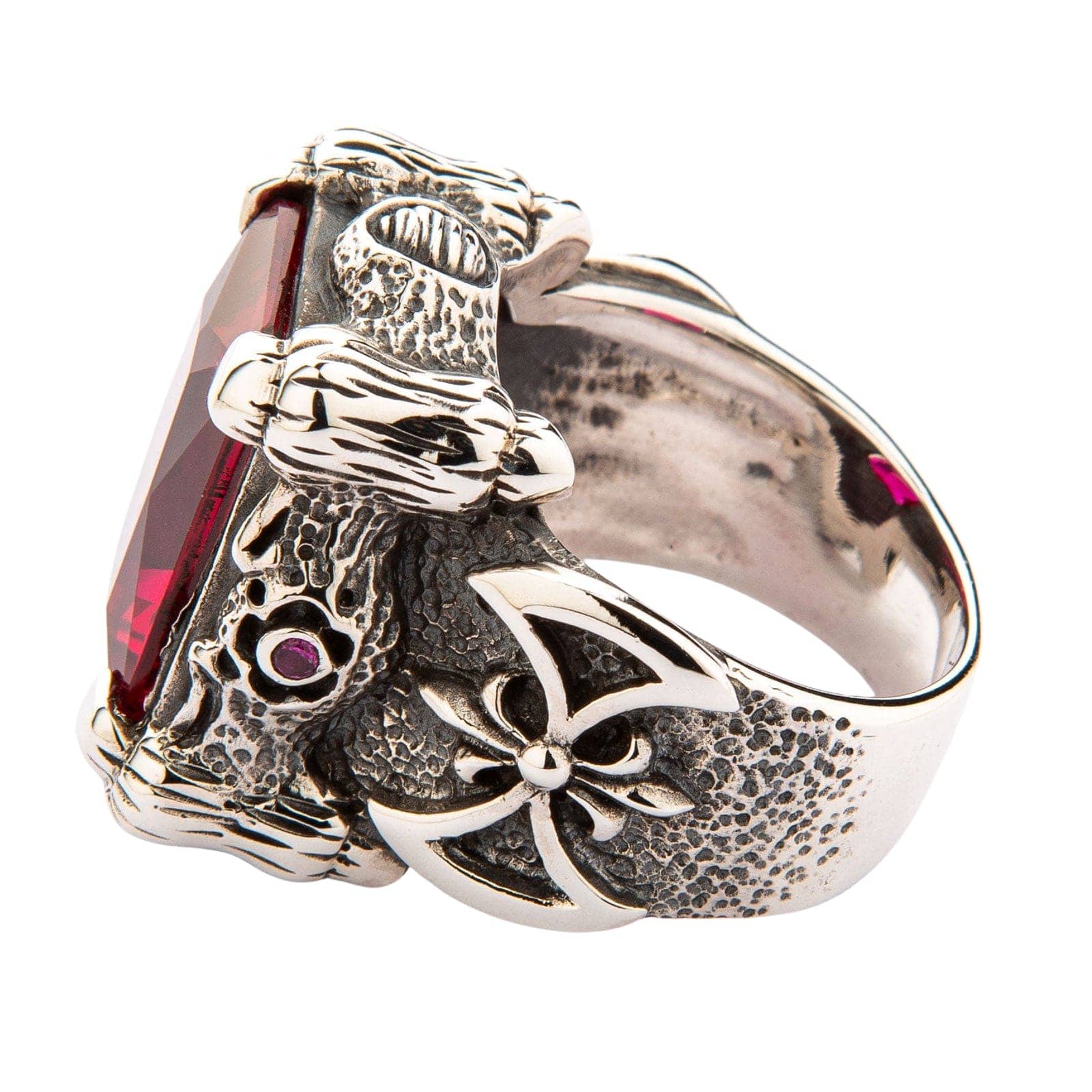В центре этого кольца пылает огромный камень изумрудной огранки, сверкающий насыщенным, огненно-красным цветом безупречного рубина. Этот великолепный самоцвет не просто закреплен, а крепко удерживается четырьмя детализированными когтями дракона. Каждый коготь — доказательство мастерства наших ювелиров: каждая чешуйка и сустав тщательно вырезаны из серебра. Ободок кольца — настоящее произведение искусства с грубой фактурной отделкой и мощными символами боевого топора по бокам, что придает украшению средневековый, готический характер.