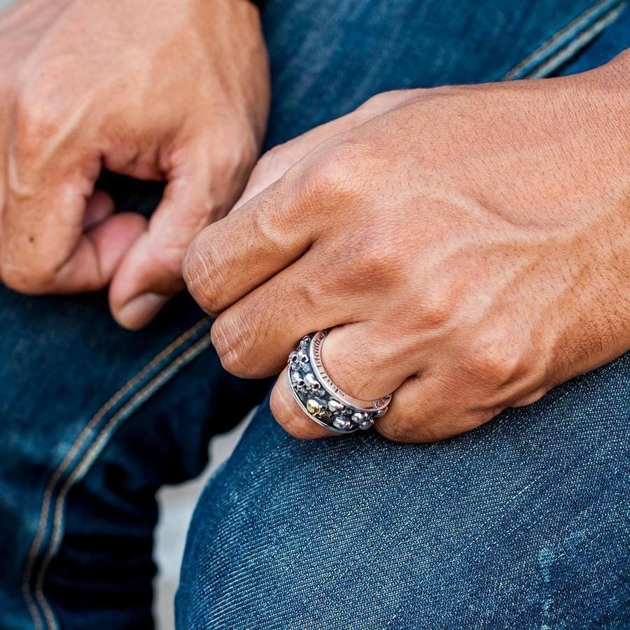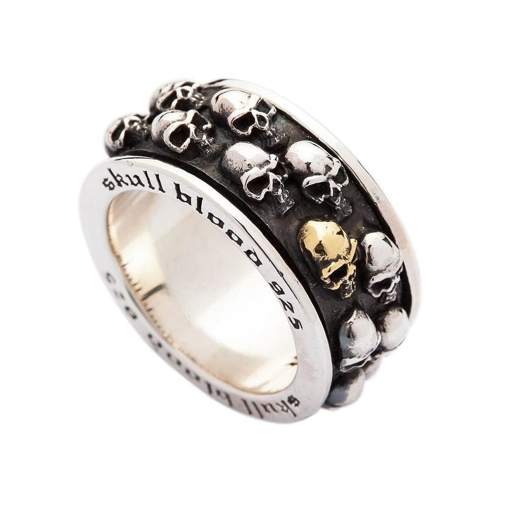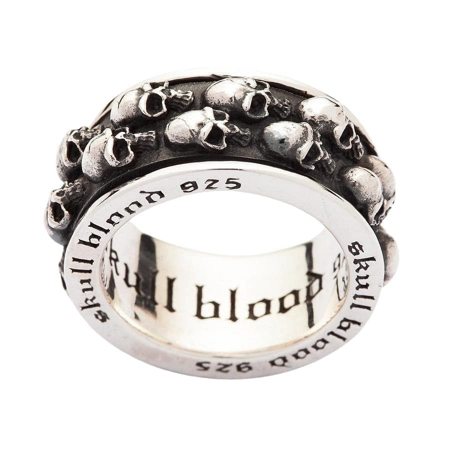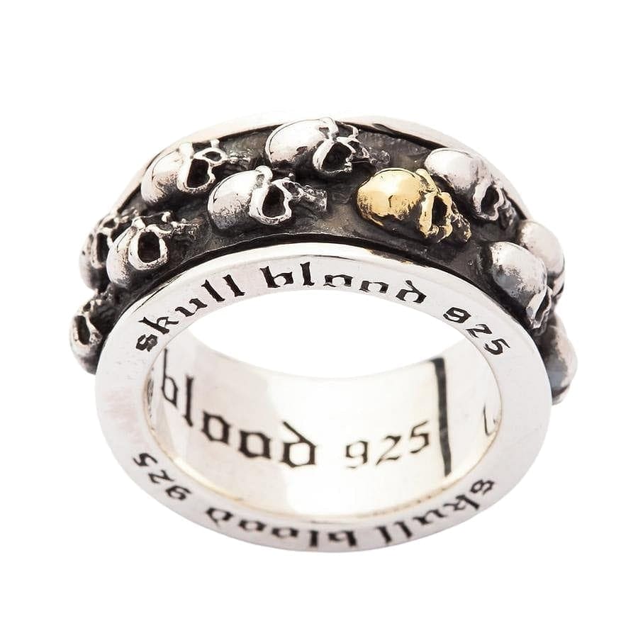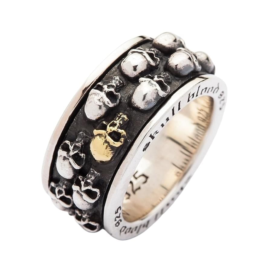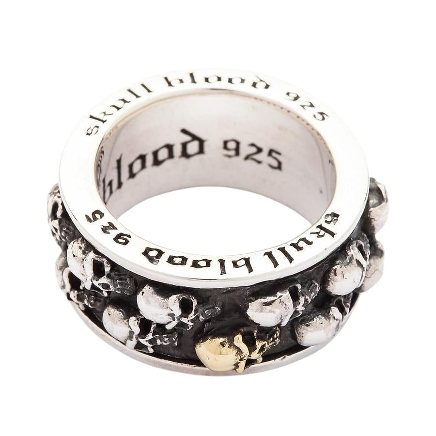 В основе кольца — широкая массивная шинка, отполированная до зеркального блеска и украшенная изнутри готической гравировкой для скрытого акцента. Главная изюминка — центральная вращающаяся полоса, усыпанная множеством зловеще ухмыляющихся черепов на тёмном, окислённом фоне. Среди этого легиона серебра один череп выделяется вызывающе: он покрыт насыщенным золотым напылением, создавая эффектную двухцветную композицию.