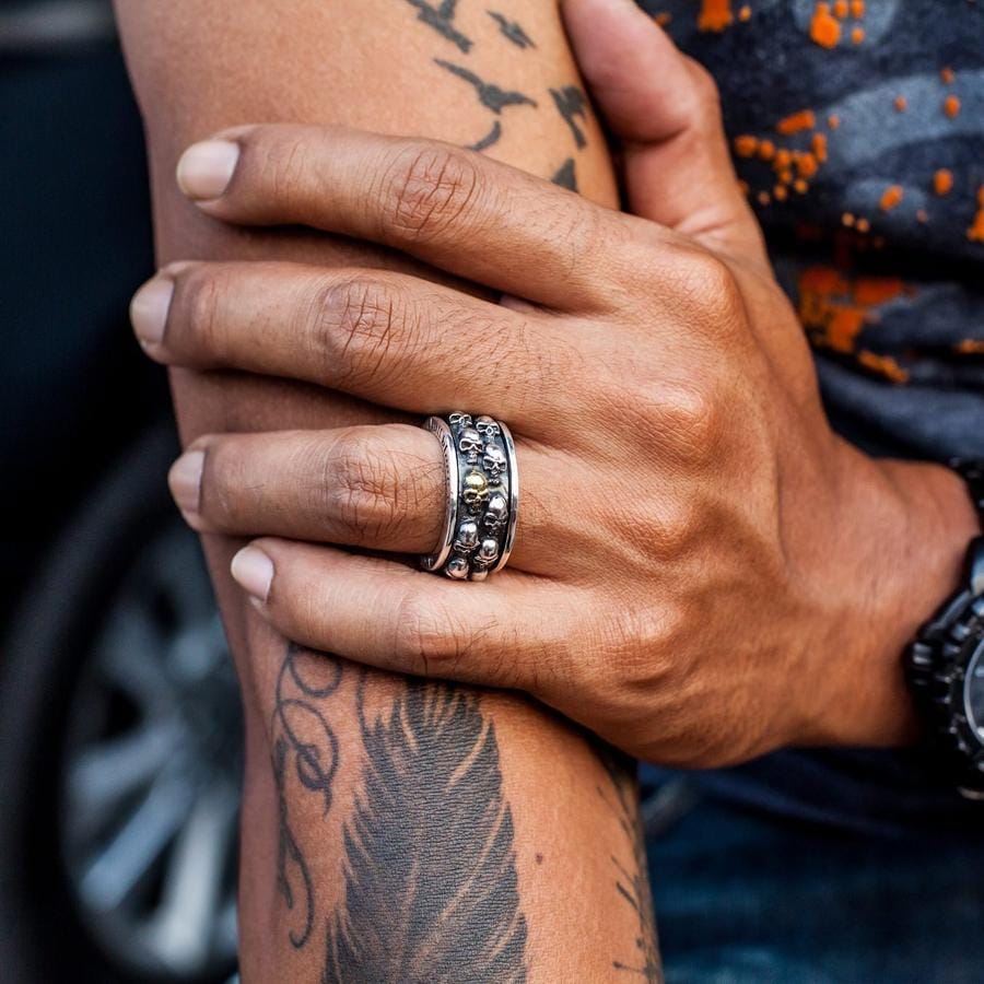 Выразительные готические детали: Вращающееся кольцо украшено множеством черепов на оксидированном фоне, с одной яркой черепом с позолотой в качестве акцента.
