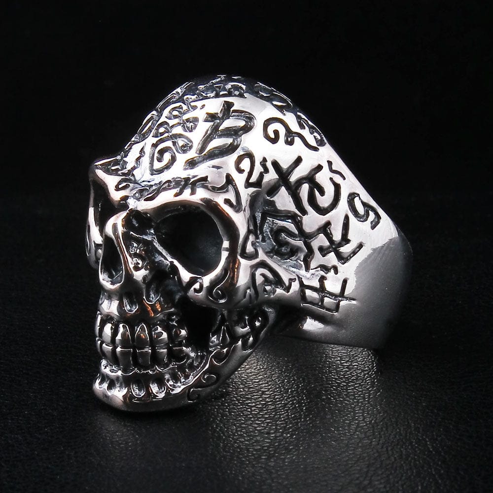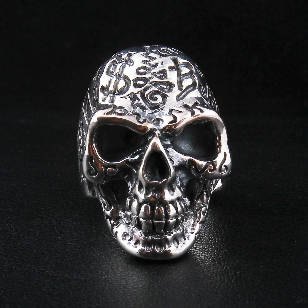 Это кольцо воплощает дух тату-культуры с гравированными знаками доллара, цифрами и орнаментальными завитками, украшающими череп. Полые глазницы и зловещая ухмылка придают ему агрессивности, а полированное серебряное покрытие подчеркивает премиальное качество работы. Идеально для байкеров, поклонников готики и коллекционеров уникальных колец с черепами.