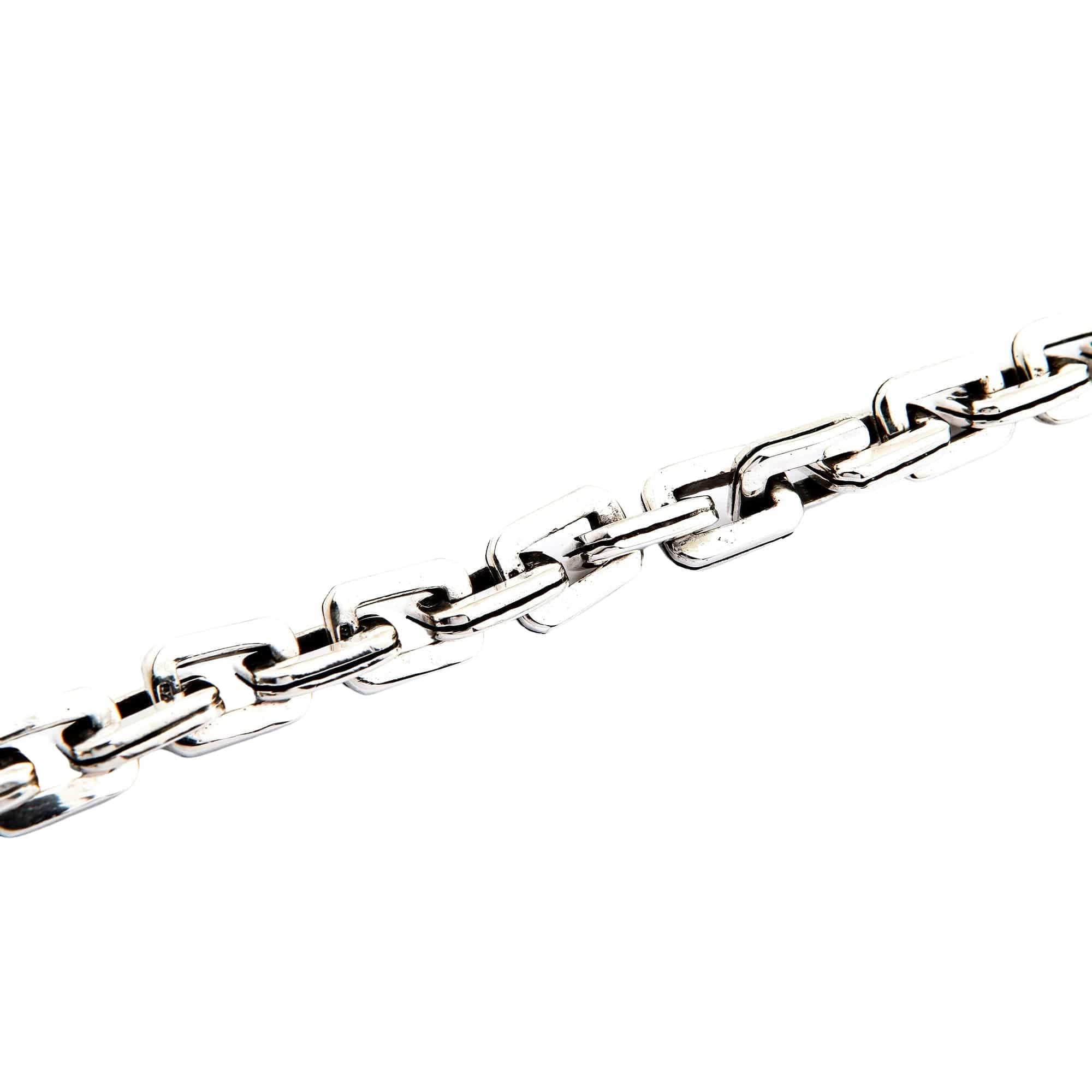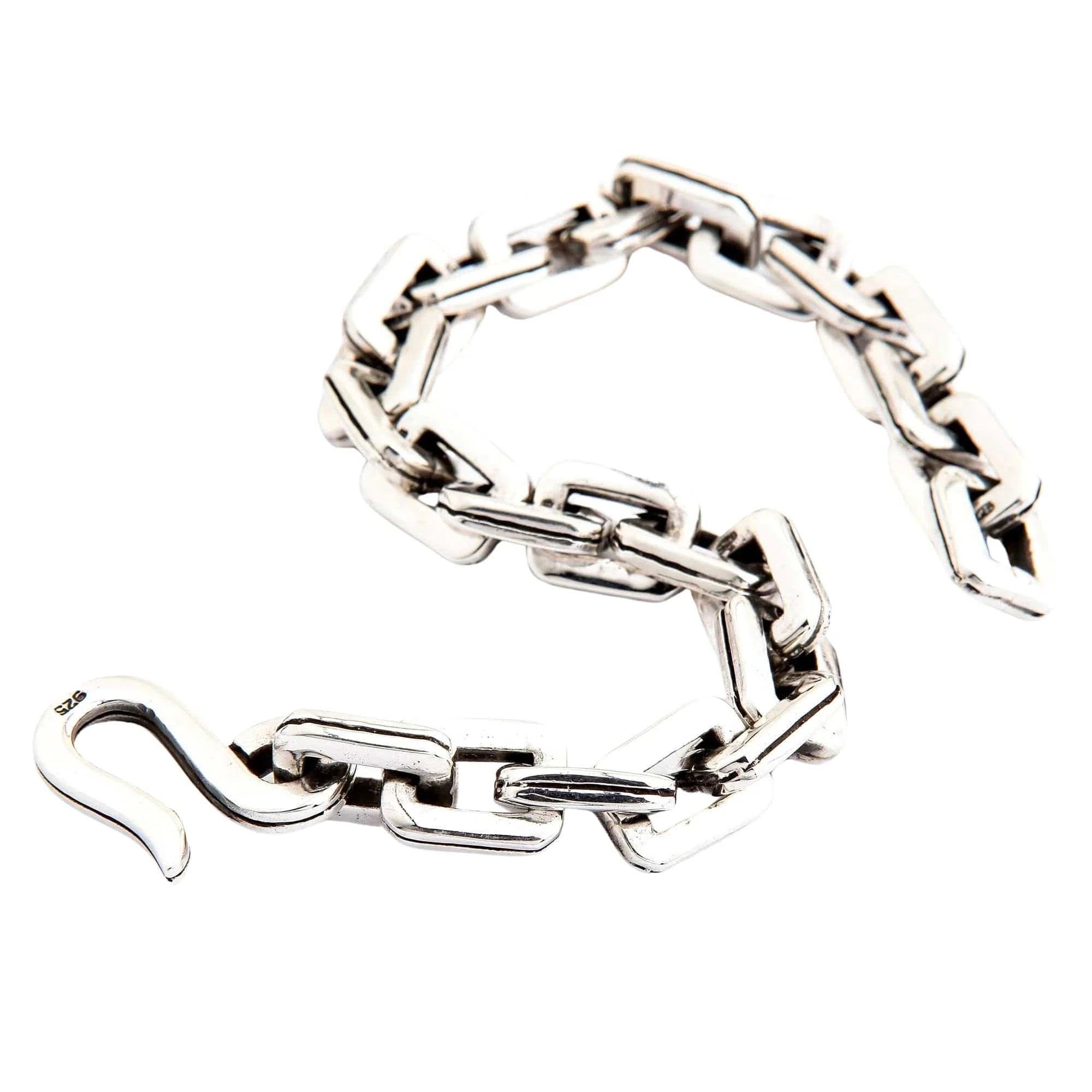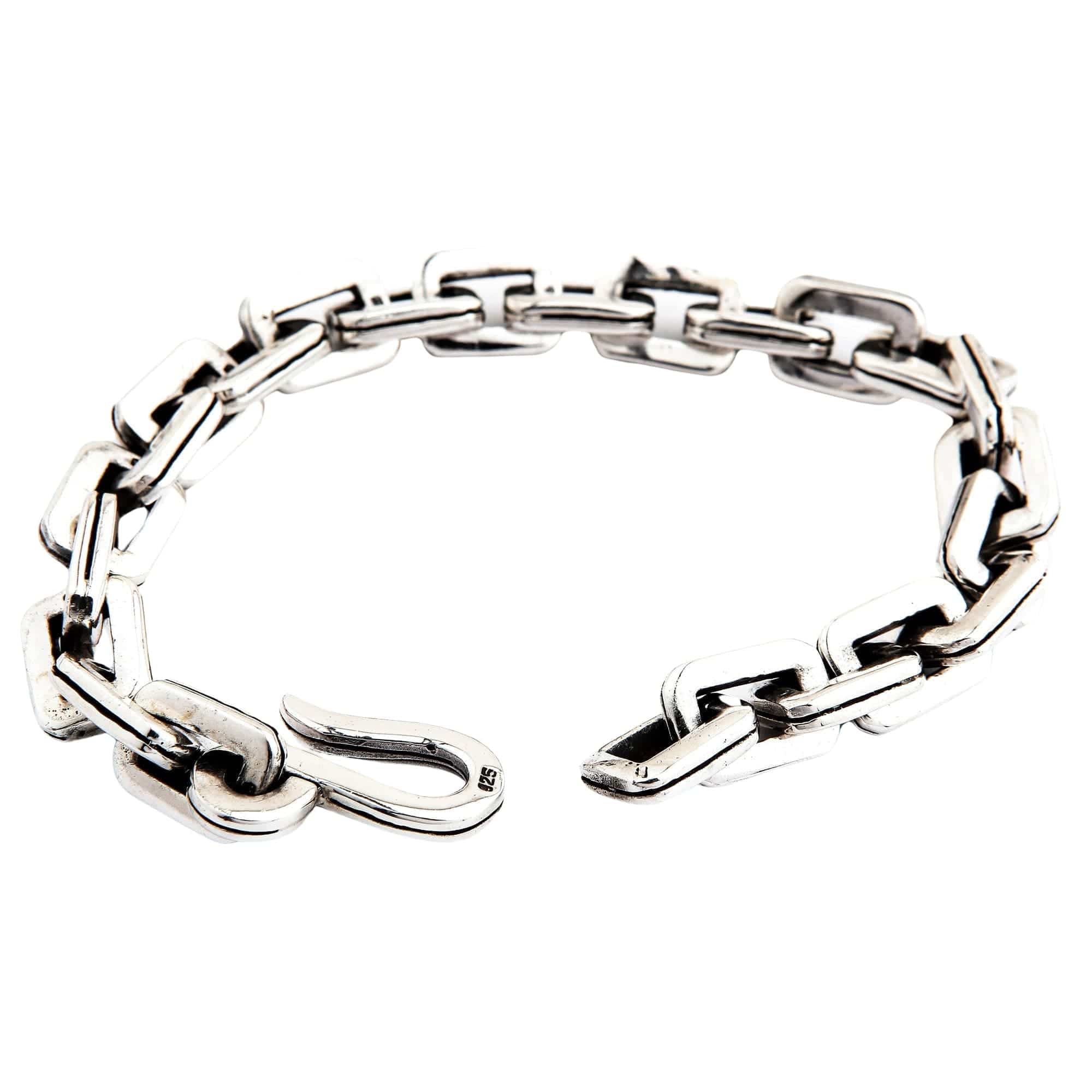 Detta är ett riktigt tungt silverkedjearmband, designat för att kännas på armen. Dess rejäla vikt är en ständig, betryggande påminnelse om dess massiva silverkonstruktion och överlägsna kvalitet. Varje länk är individuellt gjuten och noggrant polerad av våra skickliga hantverkare, vilket ger en strålande glans som framhäver dess robusta, maskulina form. Det är ett mångsidigt statement-smycke som är tufft nog för vägen men stilfullt nog för vart livet än tar dig.