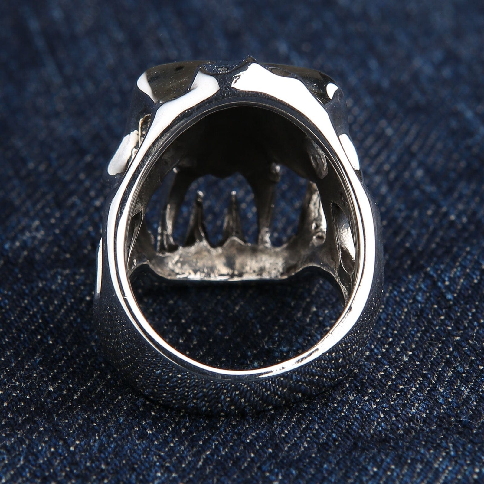 Denna ring förkastar traditionell design till förmån för ren, aggressiv konstnärlighet. Dess högst abstrakta, nästan utomjordiska form definieras av en slående genombruten konstruktion som skapar en ihålig, skelettlik känsla – både visuellt komplex och förvånansvärt bekväm för sin storlek. Designen domineras av två enorma, spegelpolerade sabeltänder som hotfullt böjer sig nedåt. Ovanför tronar två briljanta, klara Diamond CZ-stenar, som stirrar ut under ett tungt, bepansrat bryn med en isig, orubblig blick. Detta är den kalla blicken hos en sann topprovdjur, som symboliserar inte het ilska utan beräknande kraft och odödlighet. Ringens verkliga styrka är dess enorma substans. Med en imponerande vikt på 38 gram är detta ett massivt stycke sterlingsilver som känns lika kraftfullt och intelligent som besten den representerar.
