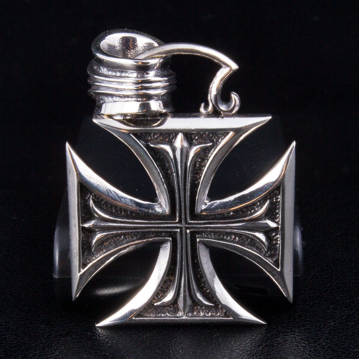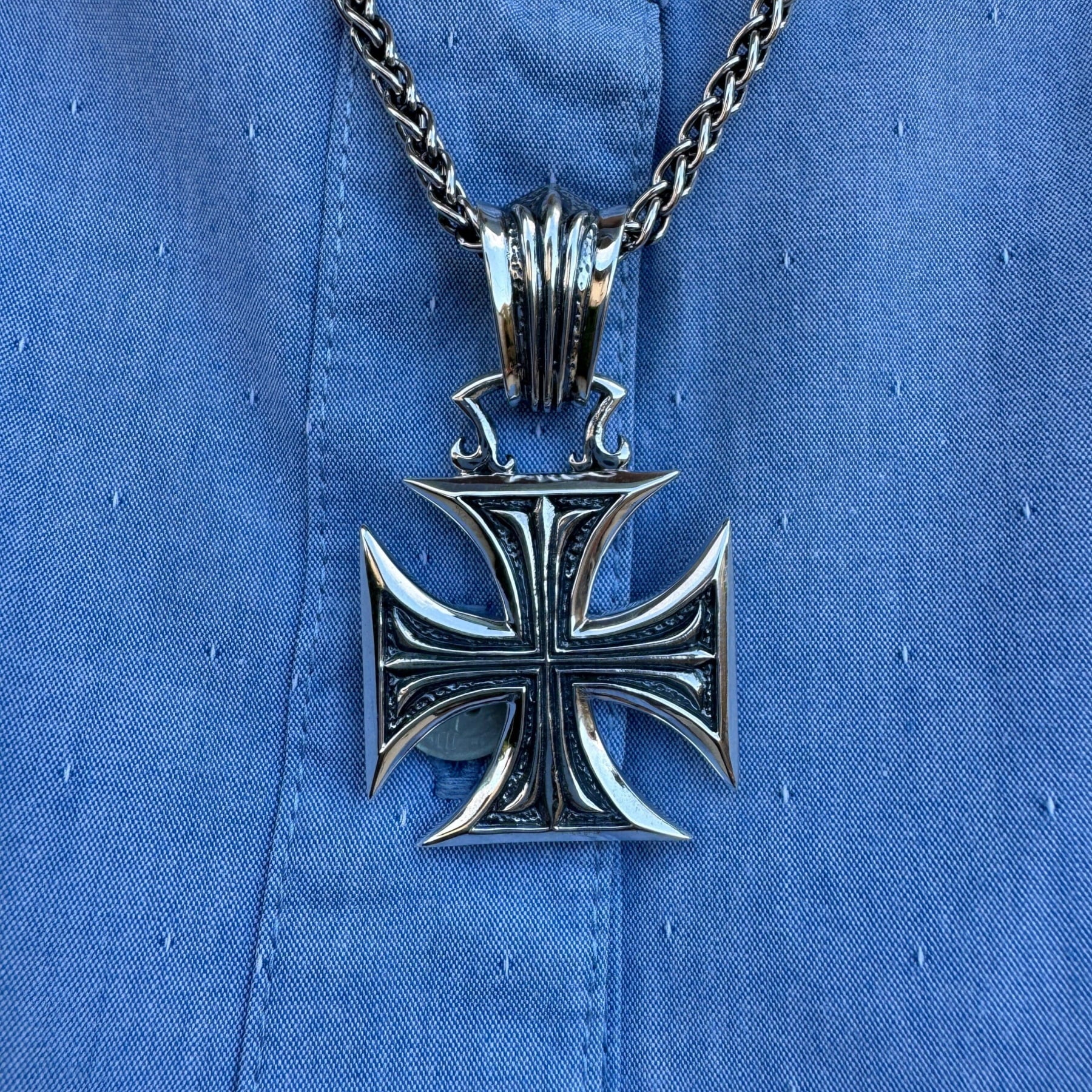 Järnkorset, med sina karakteristiska utsvängda armar (en design känd som cross pattée), har en lång och rik historia. Ursprungligen använd av Tyska Orden som en symbol för mod, återtogs det senare av efterkrigstidens motkulturer. Bikers, rockers och punkare gjorde det till en stark symbol för trots och avståndstagande från det vanliga. Att bära detta hänge kopplar dig till arvet av utanförskap och en stark hängivenhet till personlig frihet.
