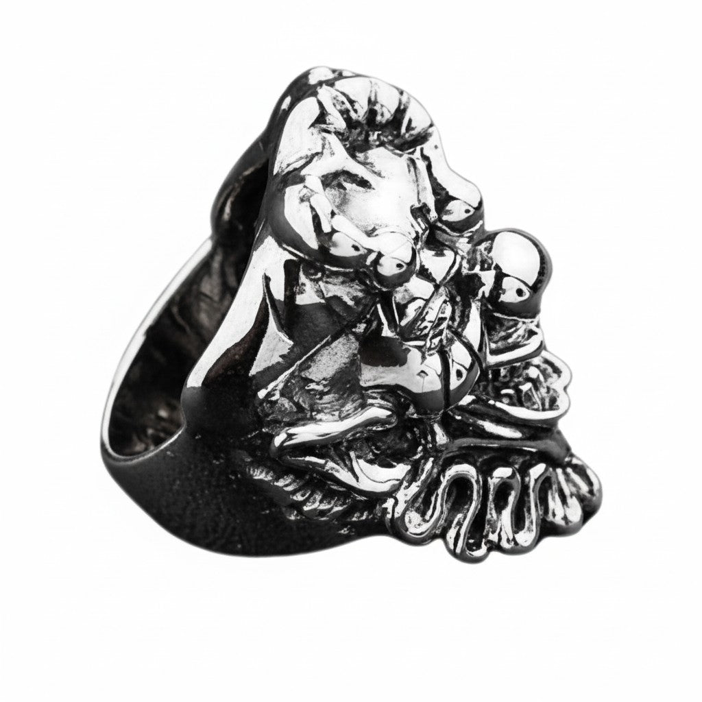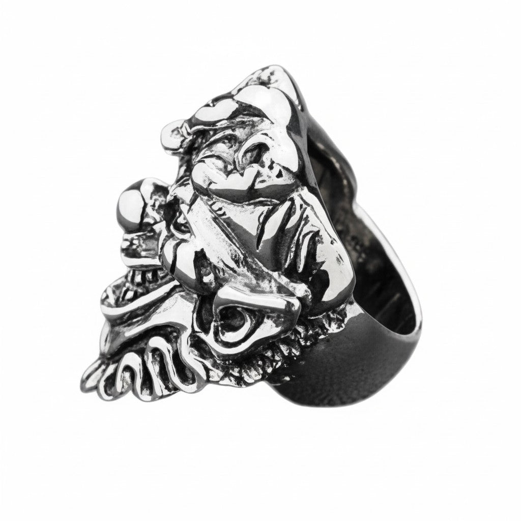 Jokern är ordningens eviga ärkefiende, en kaotisk naturkraft i form av en ond clown. Den här ringen fångar den vilda energin perfekt, från de galna, vidöppna ögonen till det tandiga, maniska flinet som lovar kaos. Det är en mäktig hyllning till den ultimata trickstern, en karaktär som finner humor i världens galenskap.