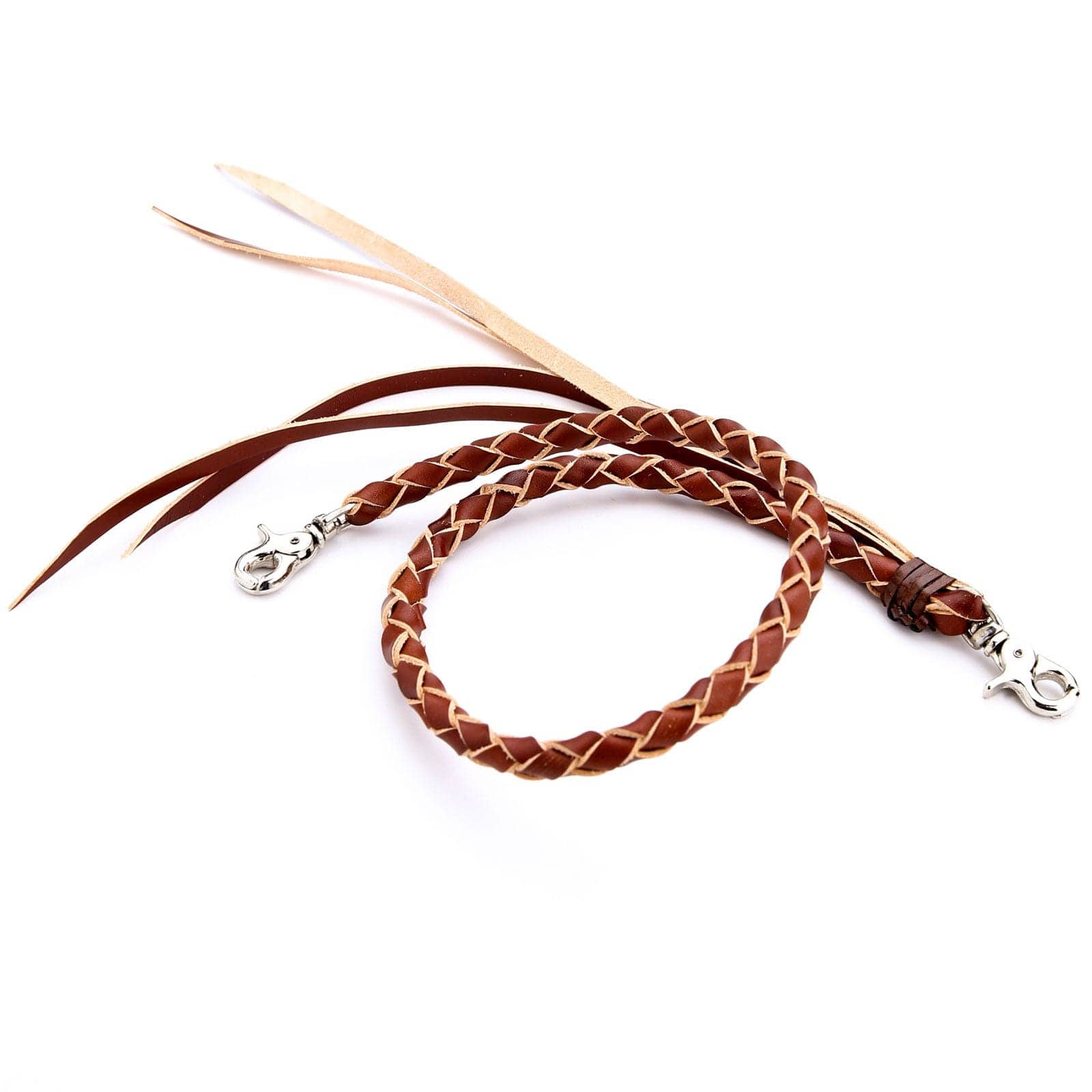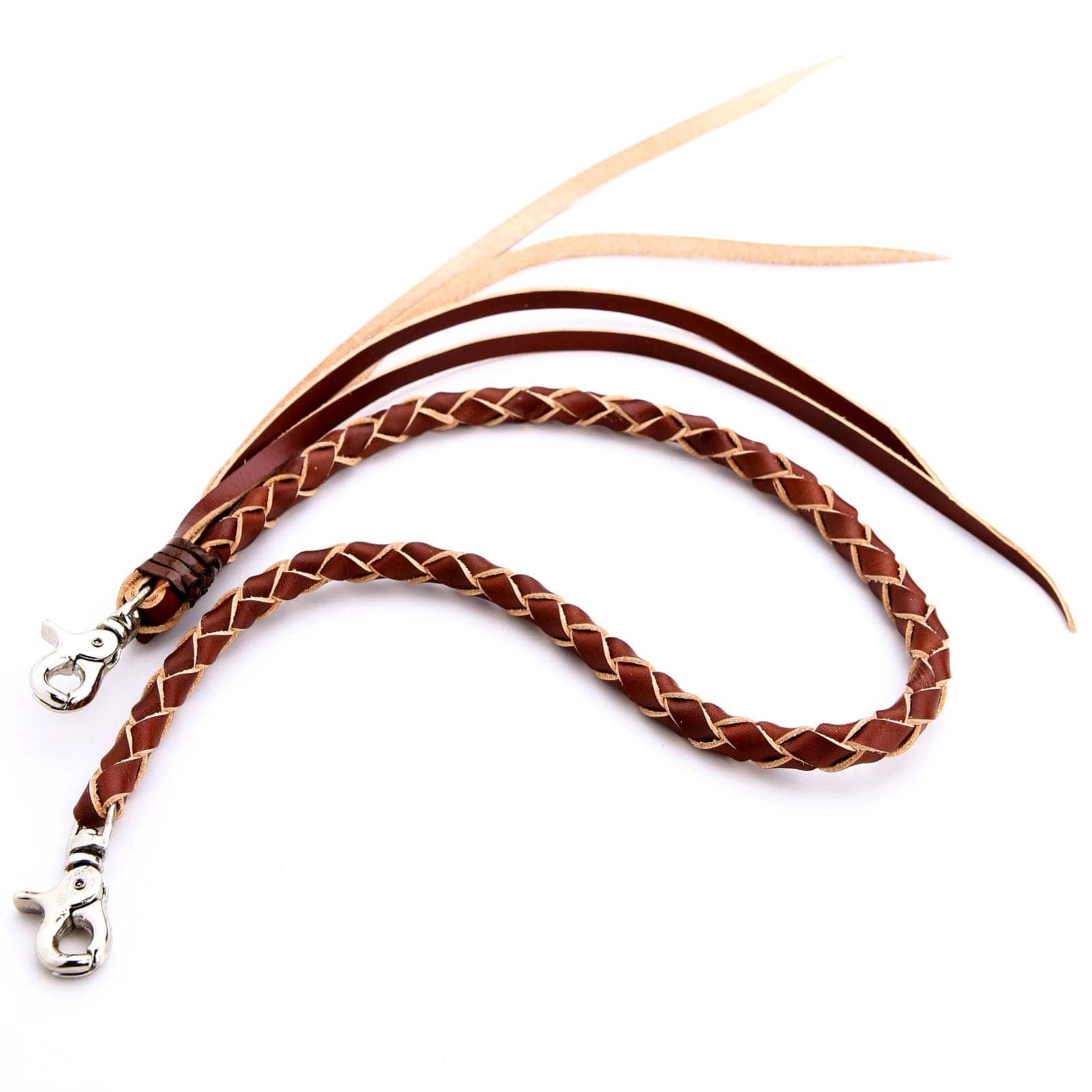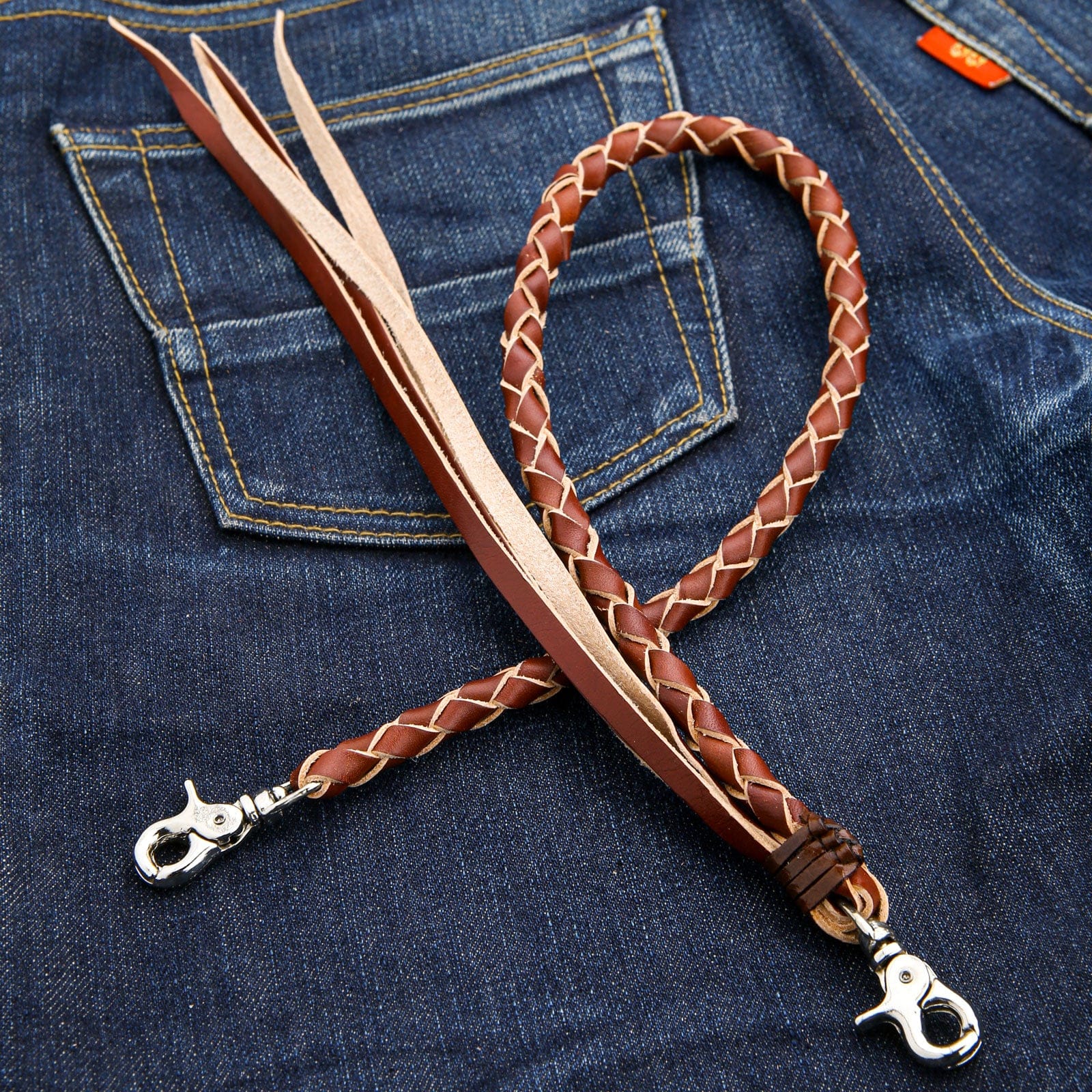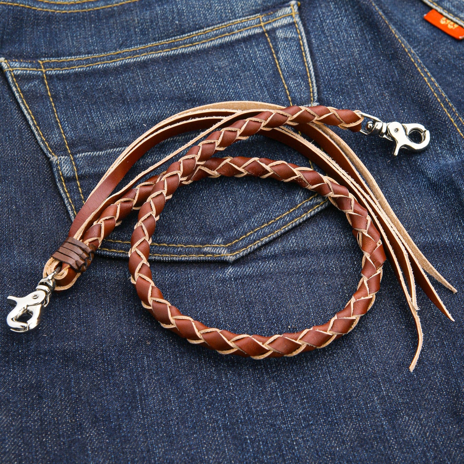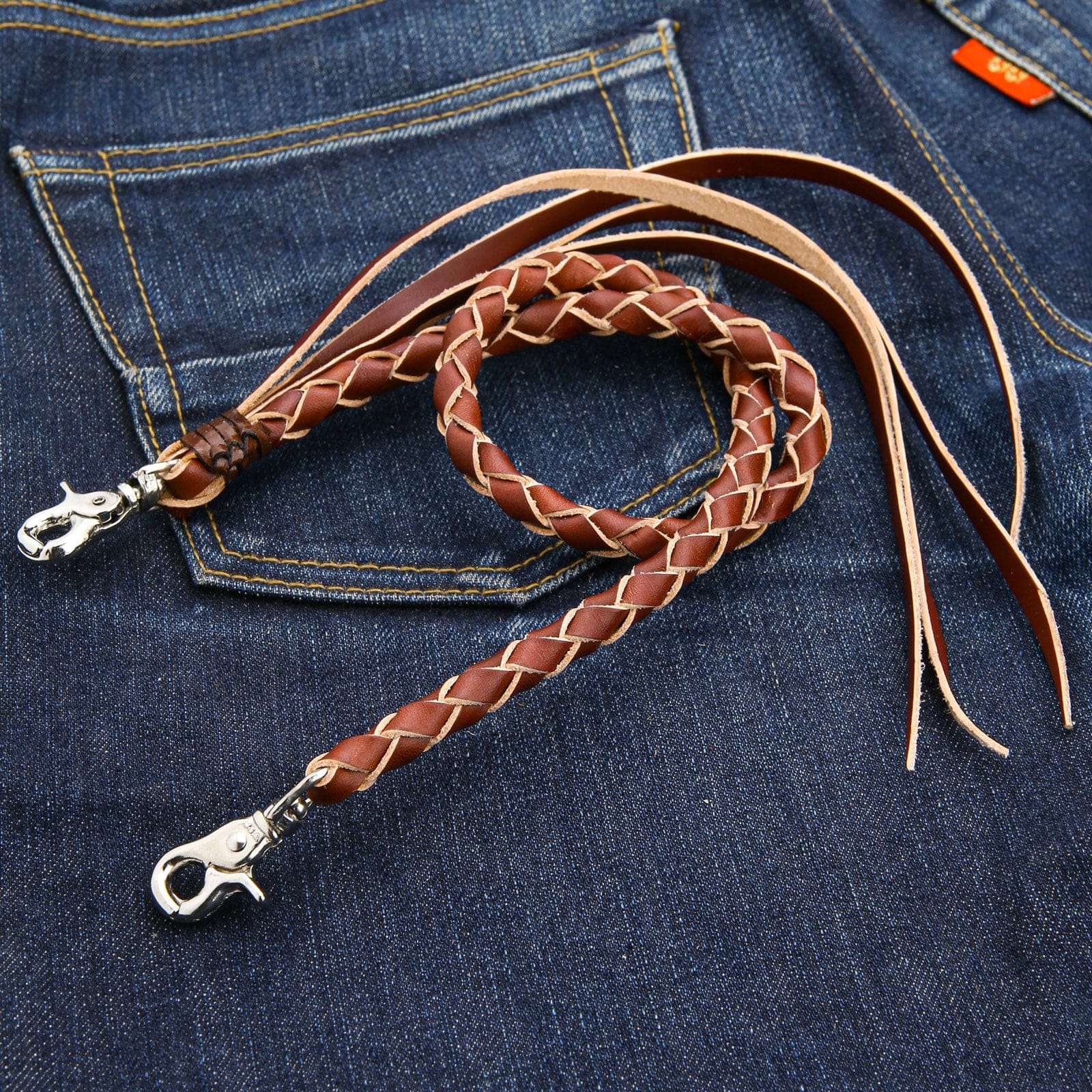 2. Är denna plånbokskedja hållbar? Absolut. Den är handgjord av 100% äkta kohudsläder, känt för sin styrka och livslängd. Den flätade designen gör den ännu starkare och mer flexibel, och de kraftiga karbinhakarna är byggda för att hålla.