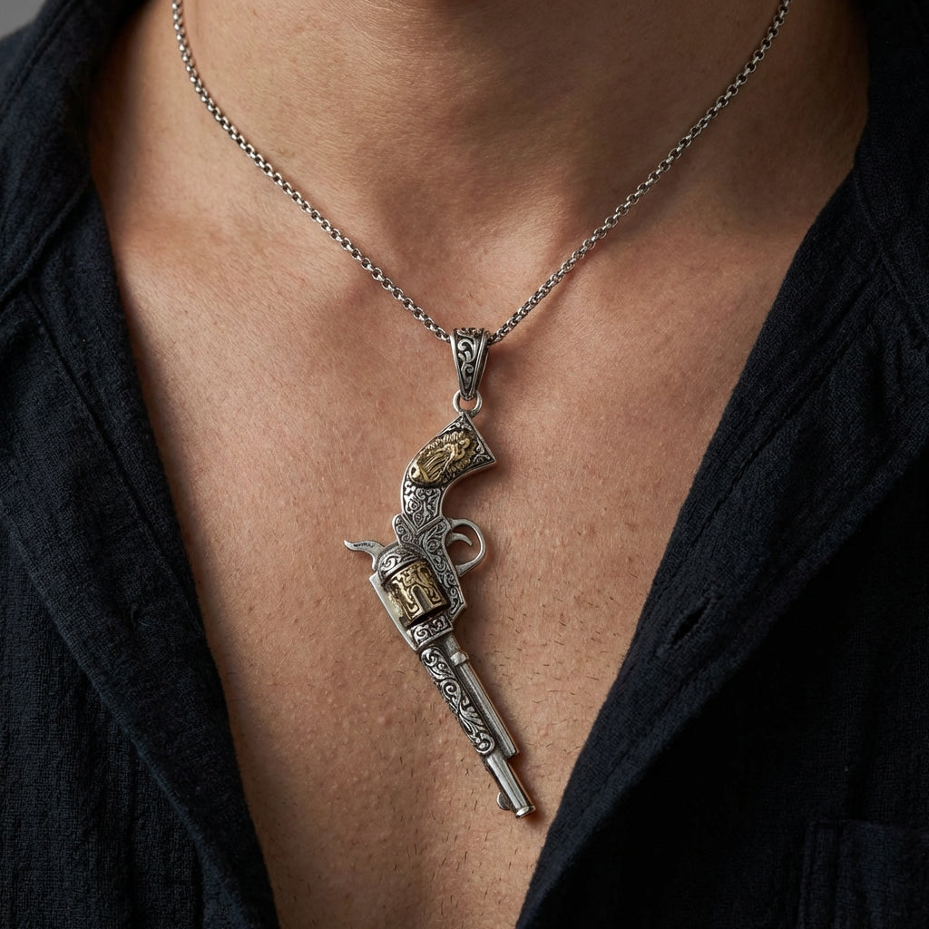 Detta hänge är ett miniatyrkonstverk, inspirerat av de utsmyckade vintage-revolvrarna som var berömda i den amerikanska vilda västern. Hela pistolkroppen är täckt av intrikat, handgraverat scrollverk, som påminner om klassisk barockgravyr. Designen är både vacker och farlig, och fångar perfekt dualiteten i revolvermannens livsstil.