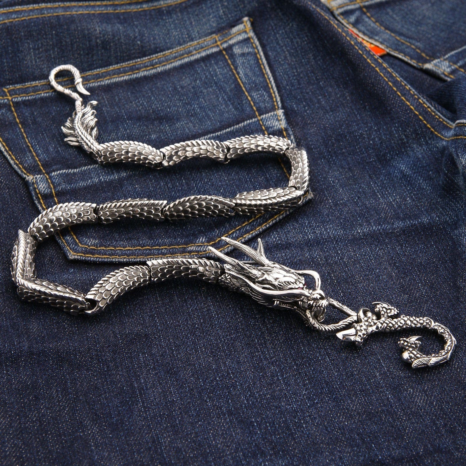 I österländsk mytologi är draken ett välvilligt och mäktigt väsen, en bringare av välstånd och en kraftfull beskyddare mot ondska. Denna plånbokskedja förkroppsligar hela den legenden. Kedjan är sammansatt av intrikat snidade, överlappande drakfjäll som bildar den mytiska bestens långa, slingrande kropp.