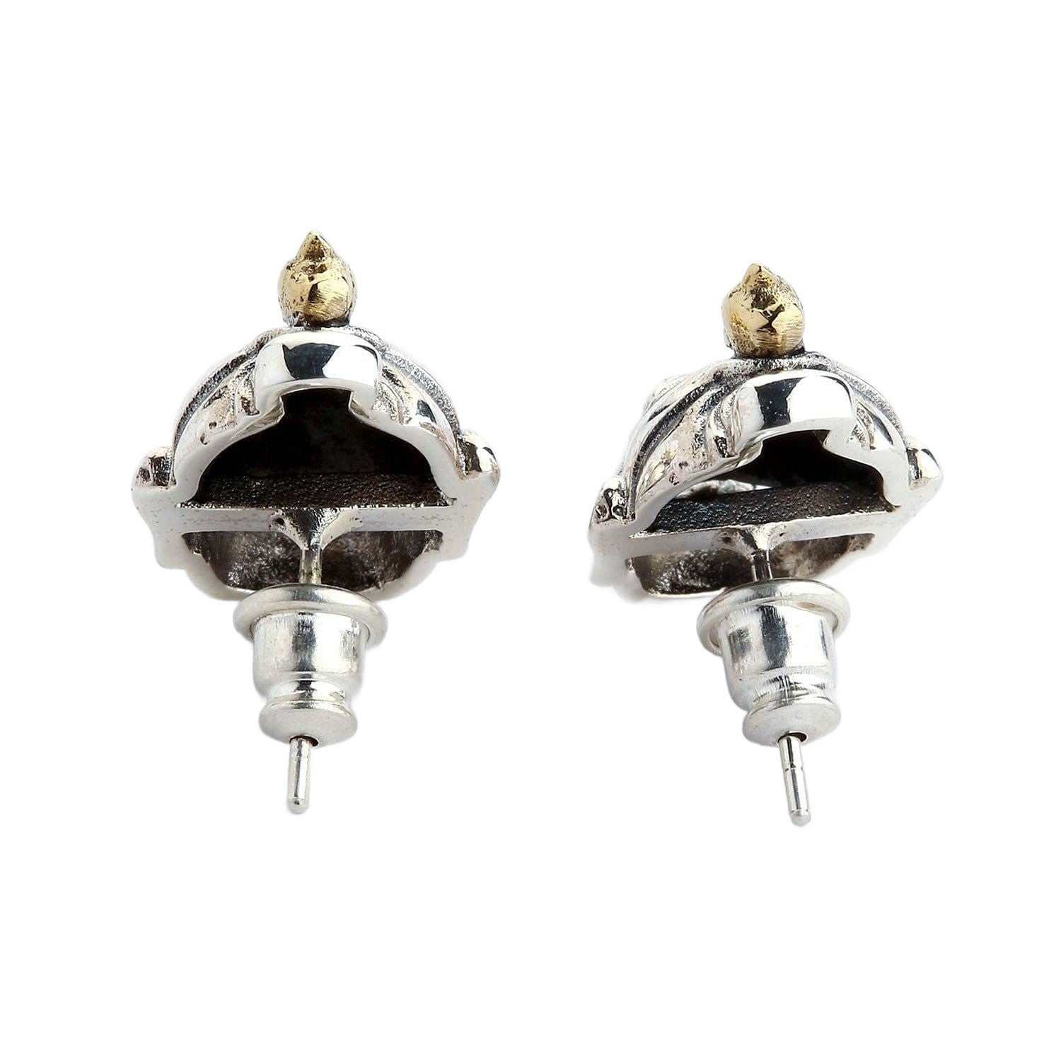 Det geniala med detta smycke ligger i dess autentiska och kraftfulla symbolik. Varje örhänge är ett detaljerat ansikte av en tibetansk skyddsgud, en vildsint väktare från buddhistiska traditioner. Ansiktet, med sina tre allseende ögon, representerar ett högre medvetandetillstånd. Kronan på denna kraftfulla mask är en enda, kontrasterande mässingsdödskalle, en stark memento mori som symboliserar den slutgiltiga segern över döden och jordisk bundenhet. Kombinationen av den heliga skyddsmasken och den dystra dödskallen skapar en djup talisman—en väktare som förstår och har övervunnit dödligheten. Varje detalj får liv med en mörk, oxiderad finish, vilket gör dessa örhängen till ett verkligt bärbart andligt konstverk.