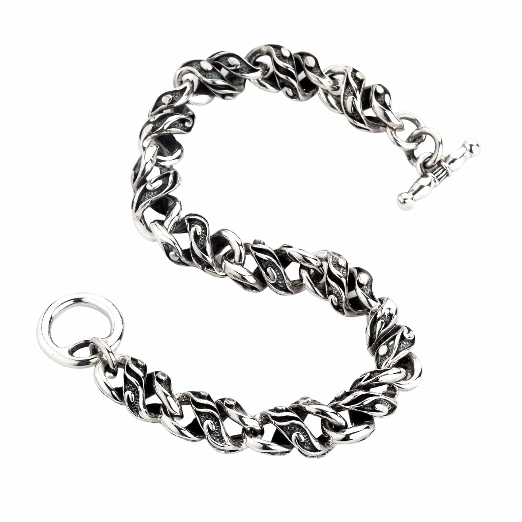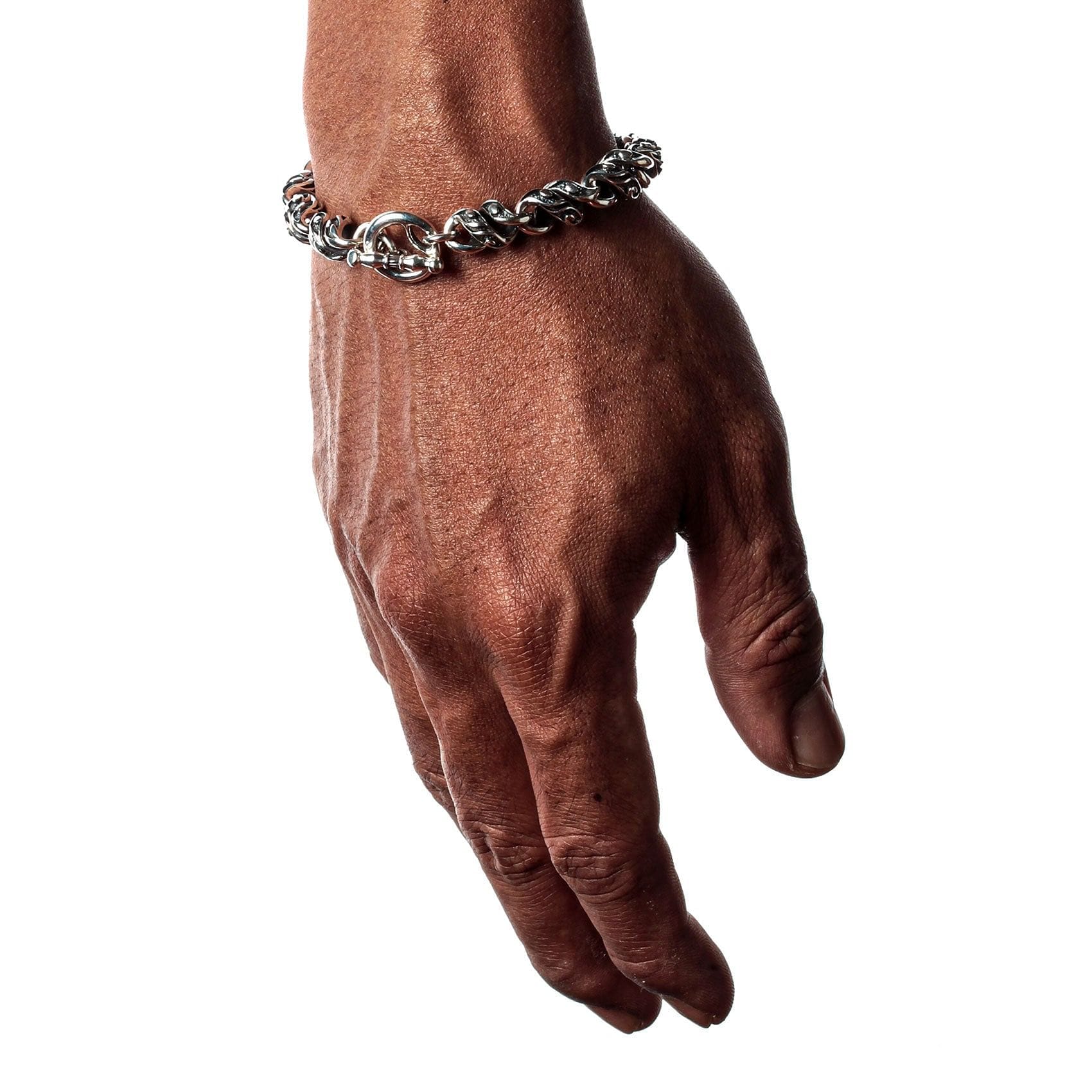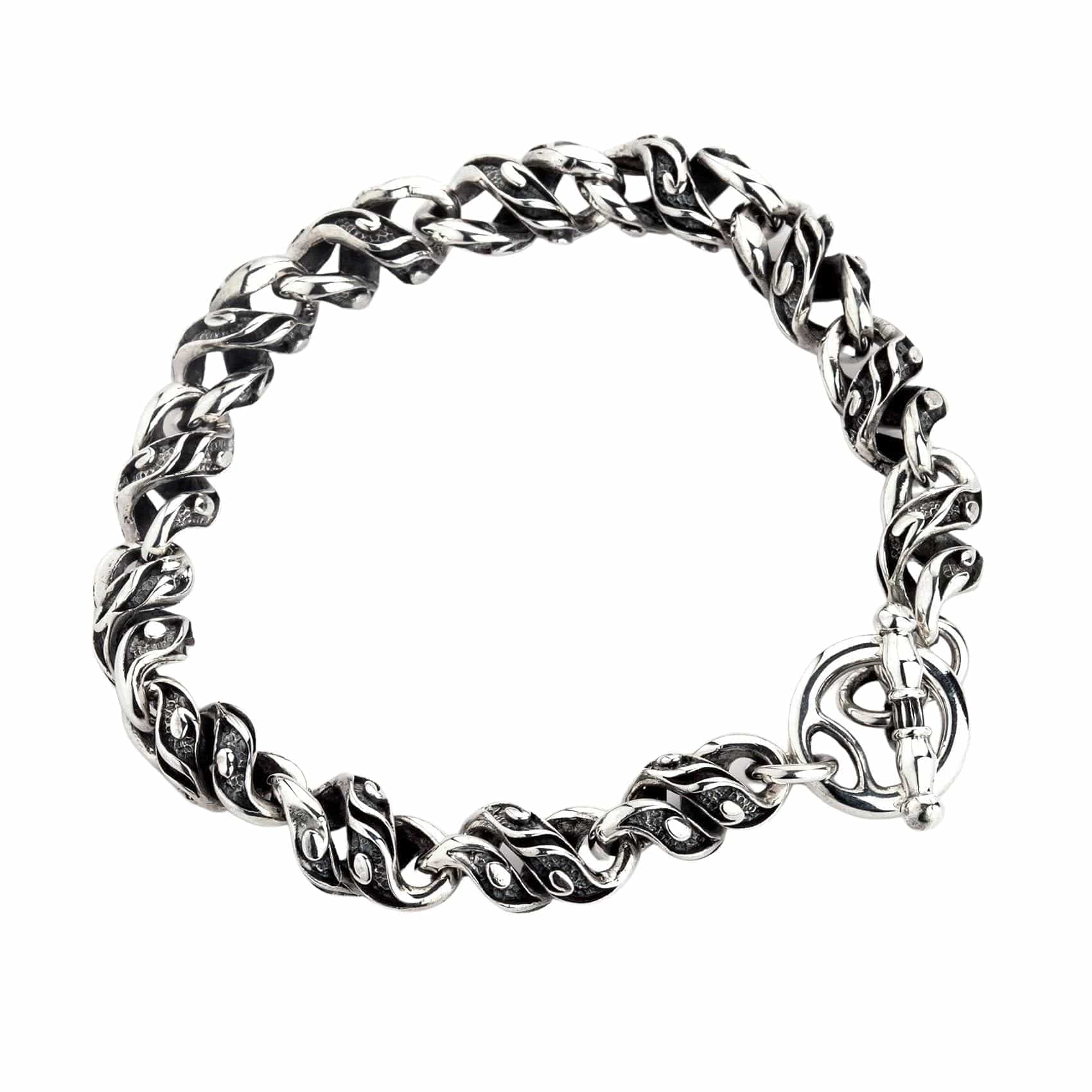 Det här är inte bara ett armband – det är ett bärbart konstverk. Vårt utsmyckade tvinnade länkarmband är ett mästerverk av flytande design och robust konstruktion, skapat för mannen som uppskattar intrikata detaljer och en kraftfull närvaro. Smitt i massivt sterlingsilver är detta ett unikt statement-smycke som rör sig med ett eget liv, och förenar uråldrig konst med en modern, rebellisk anda.