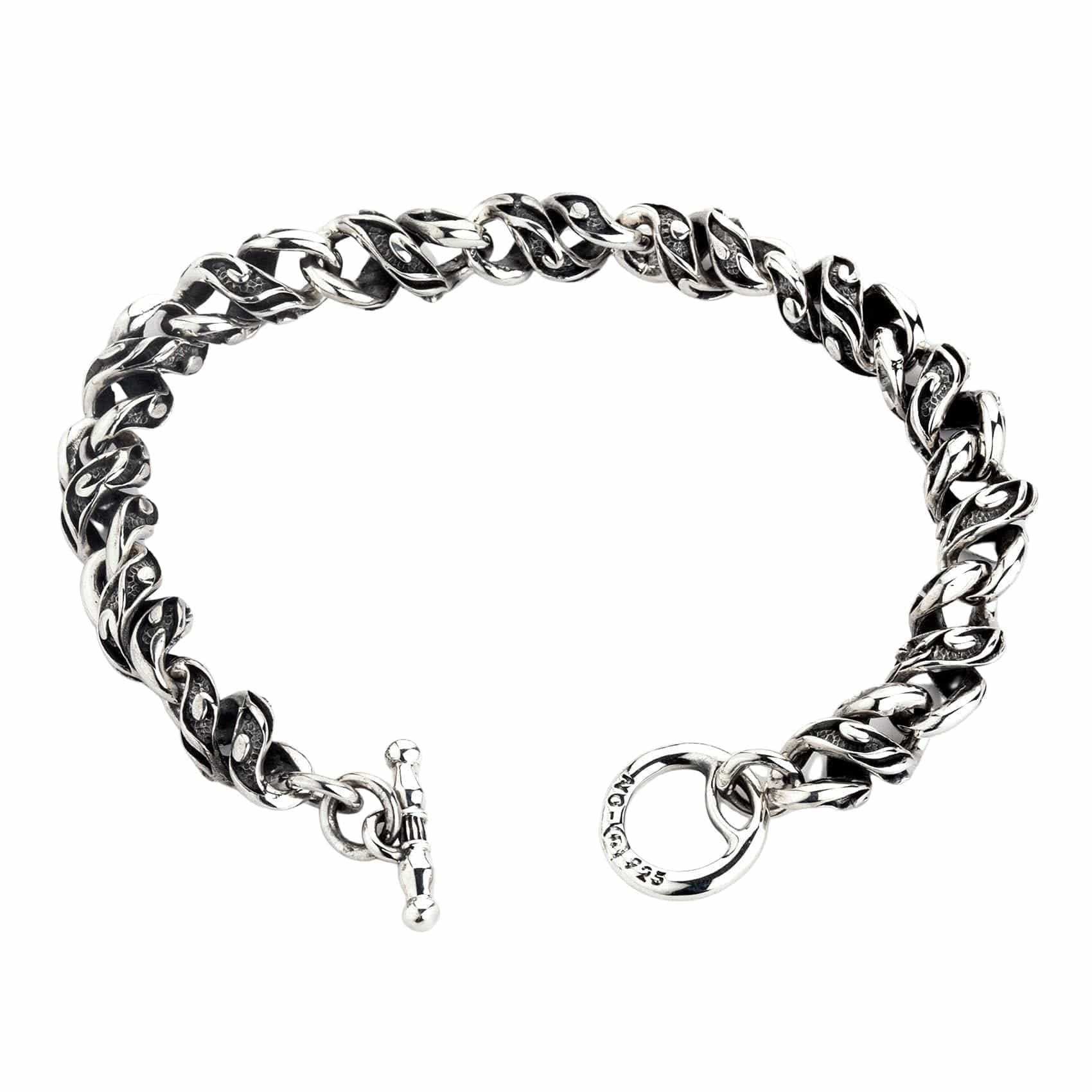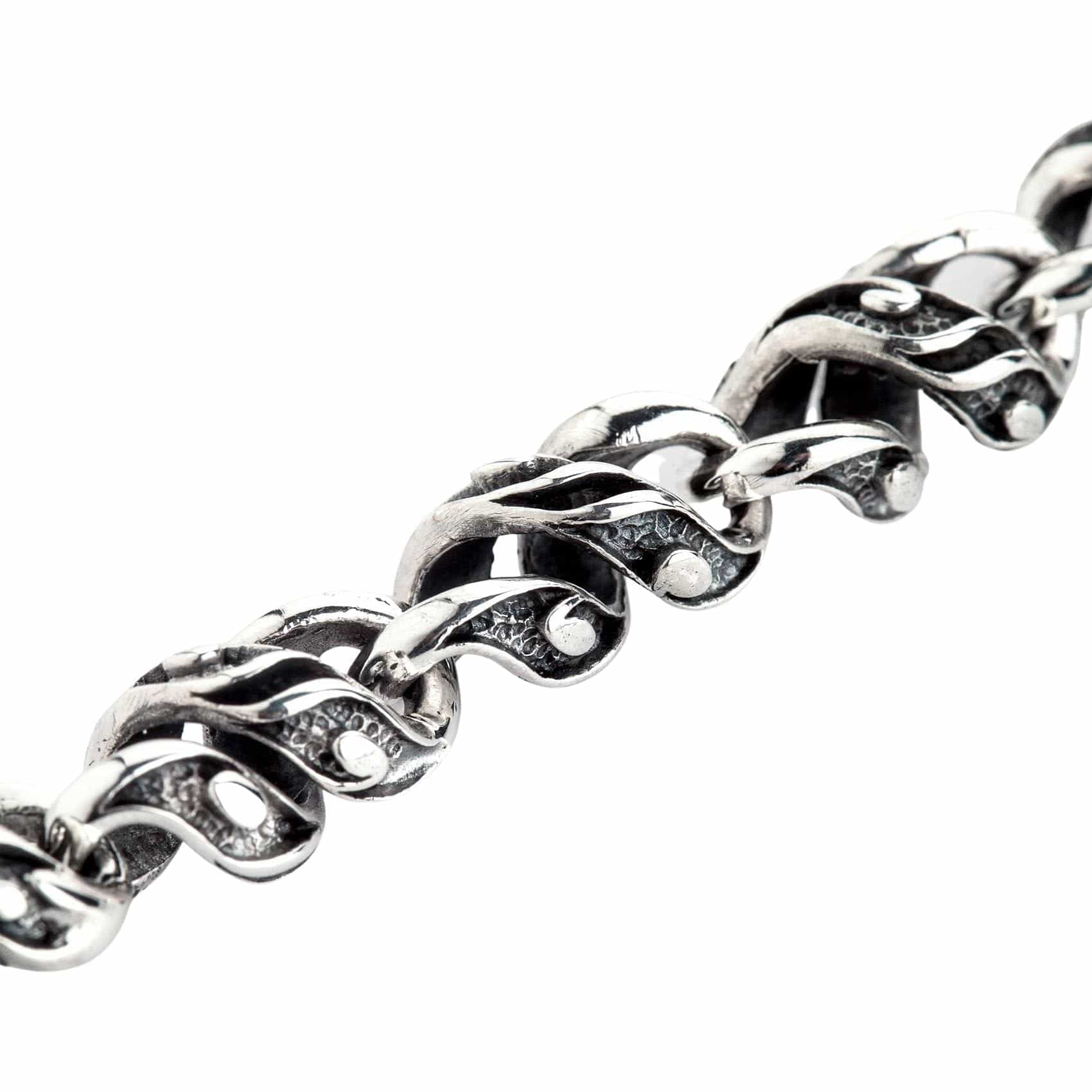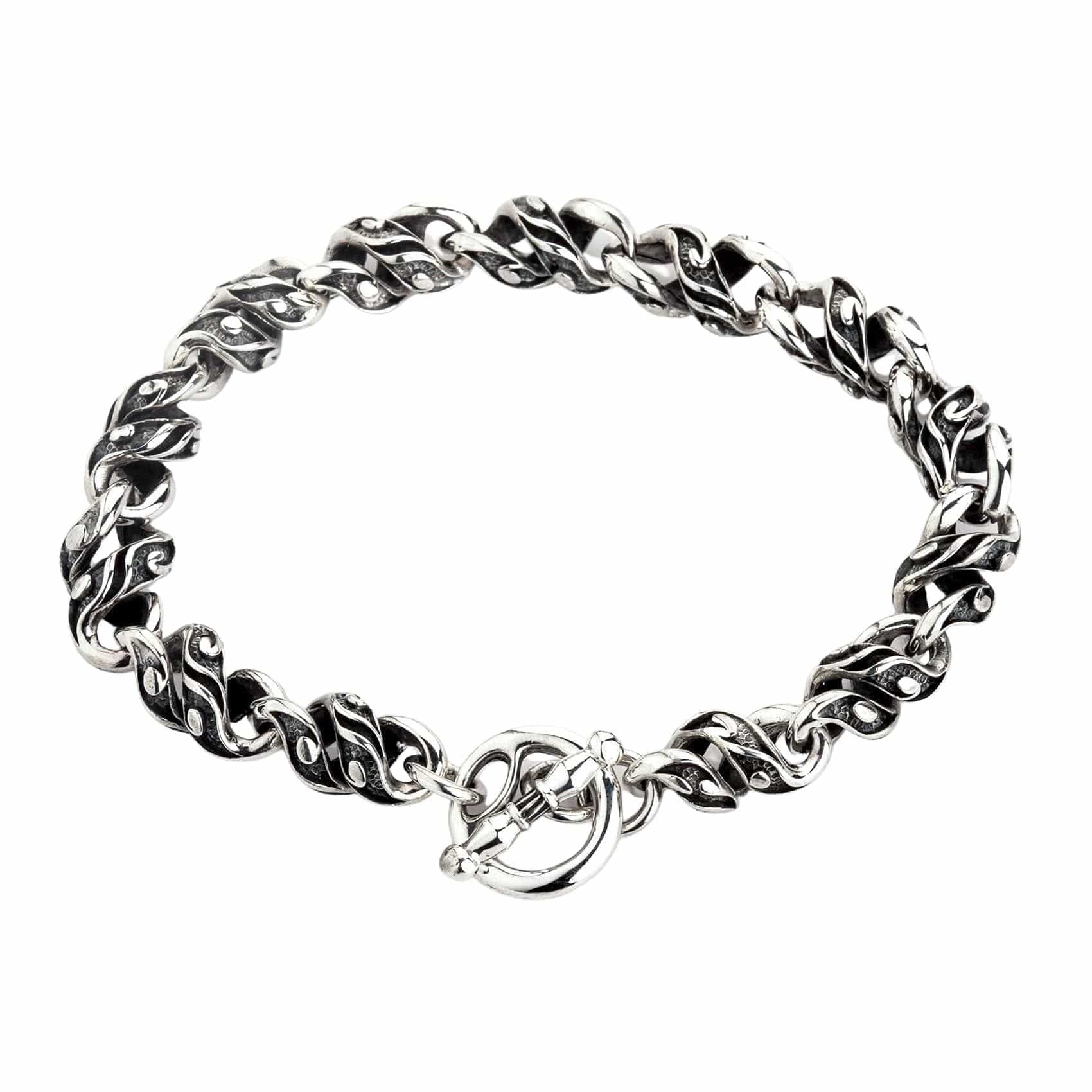Det här är inte bara ett armband – det är ett bärbart konstverk. Vårt utsmyckade tvinnade länkarmband är ett mästerverk av flytande design och robust konstruktion, skapat för mannen som uppskattar intrikata detaljer och en kraftfull närvaro. Smitt i massivt sterlingsilver är detta ett unikt statement-smycke som rör sig med ett eget liv, och förenar uråldrig konst med en modern, rebellisk anda.