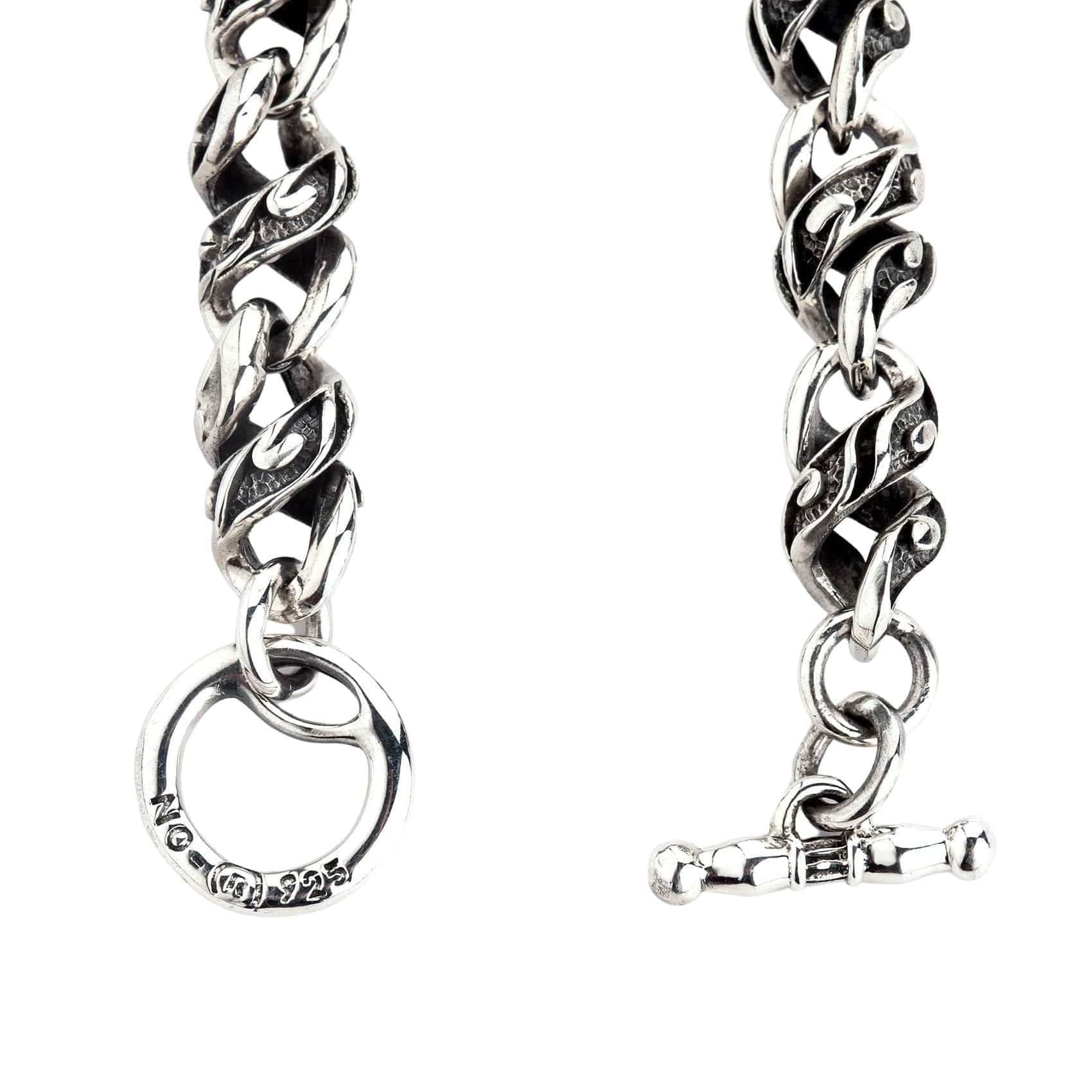 Det geniala med detta armband ligger i dess helt unika, specialdesignade länkar. Varje individuell länk är som en egen skulptur, med en tvinnad, vågformad design som är graverad med invecklade, snirkliga gotiska mönster. Detta skapar en fantastisk, dynamisk textur som är både elegant och kraftfull. Den högpolerade ytan på utsidan kontrasterar dramatiskt mot de mörka, oxiderade partierna i gravyrerna, vilket ger mönstret ett otroligt djup. Armbandet stängs med ett klassiskt, kraftigt T-lås som ger en säker passform och kompletterar armbandets robusta stil perfekt.