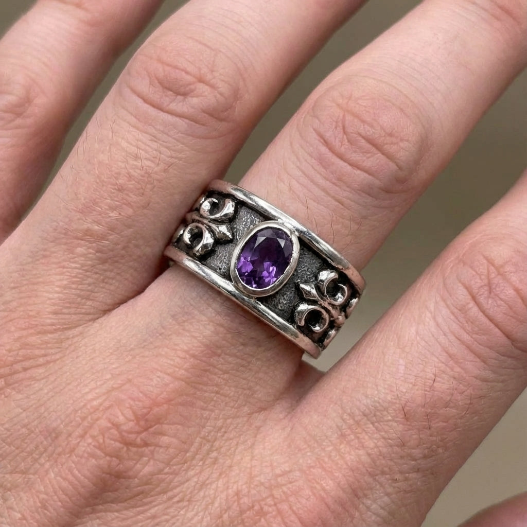 以哥德優雅提升你的造型,佩戴紫水晶百合花純銀男士戒指。擁有全實心純銀結構、精緻百合花圖騰與深邃紫水晶主石,此戒指是工藝與大膽設計的傑作。