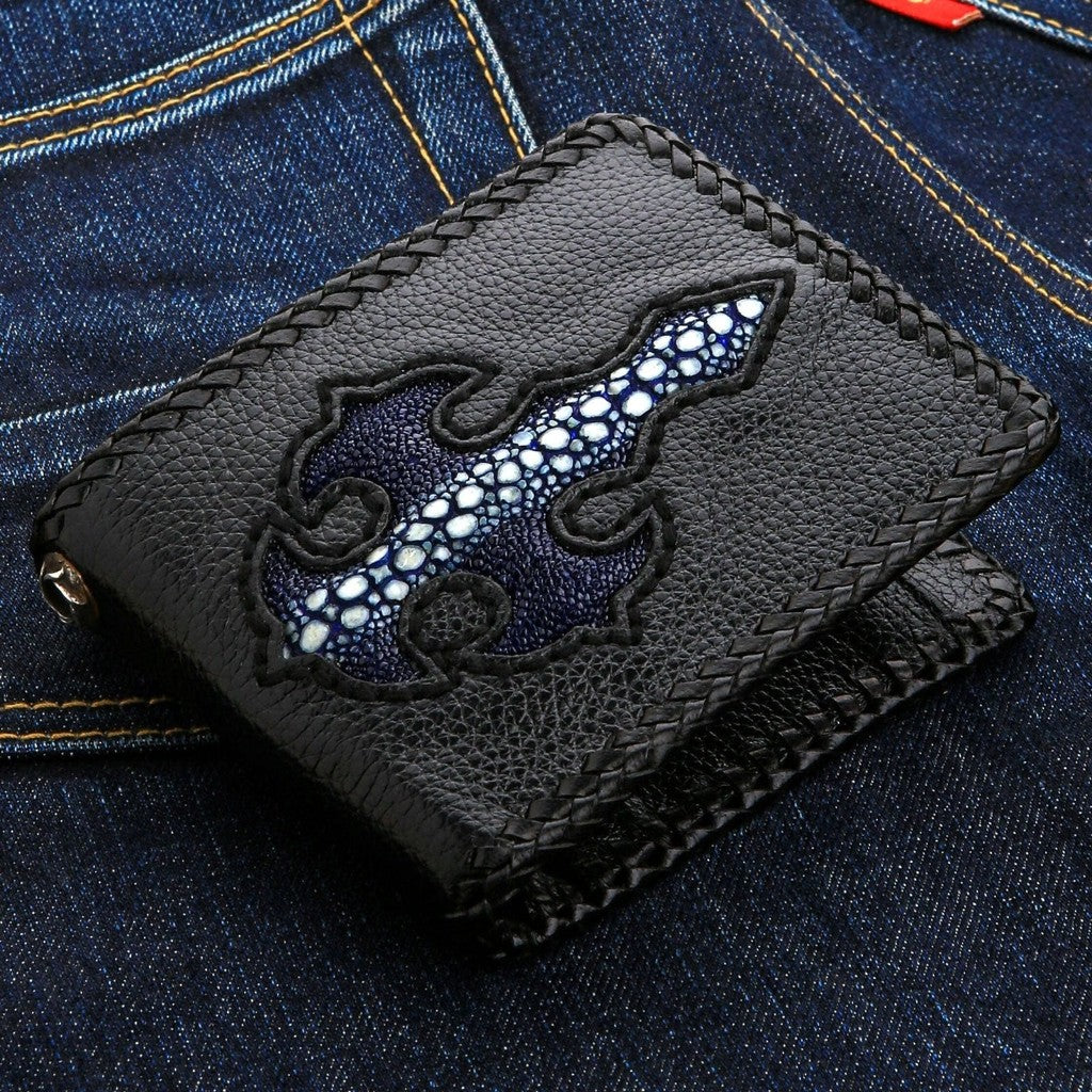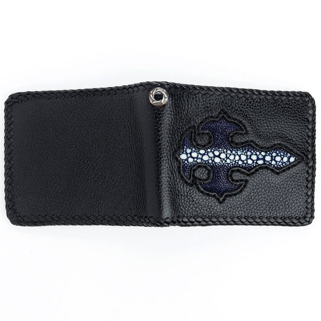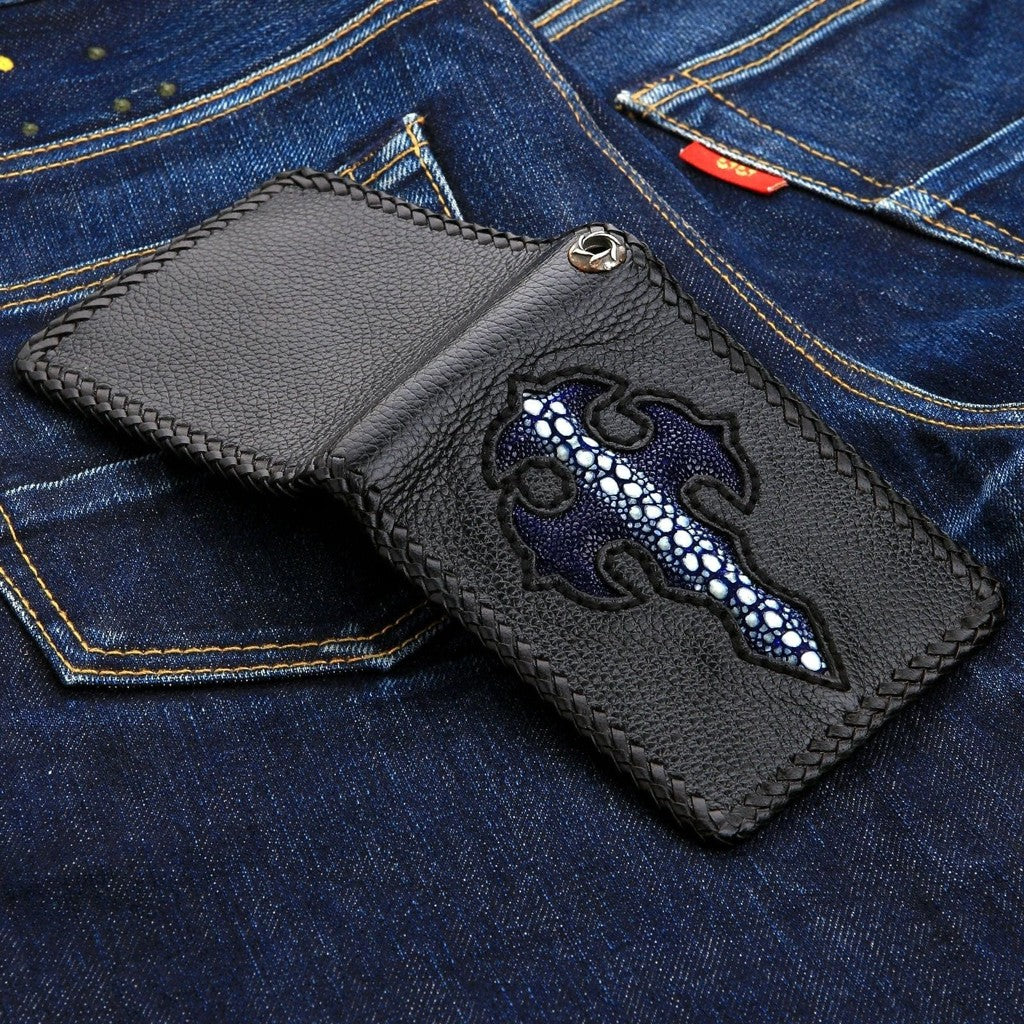 以我們的正品異國藍魟魚十字皮革重機皮夾展現你的大膽個性。嚴選頂級牛皮與藍色魟魚皮手工打造,兼具無與倫比的耐用度與搶眼美感,專為堅持自我風格的你設計。貼心規劃,設有五個卡槽、兩個大鈔票夾層及安全零錢袋,讓所有必需品井然有序。精巧尺寸(4½ 吋 x 3⅞ 吋)輕鬆放入口袋,內建銀色孔眼可連接鍊條,增添安全性。這款皮夾不僅是配件,更是風格、力量與精湛工藝的最佳見證。