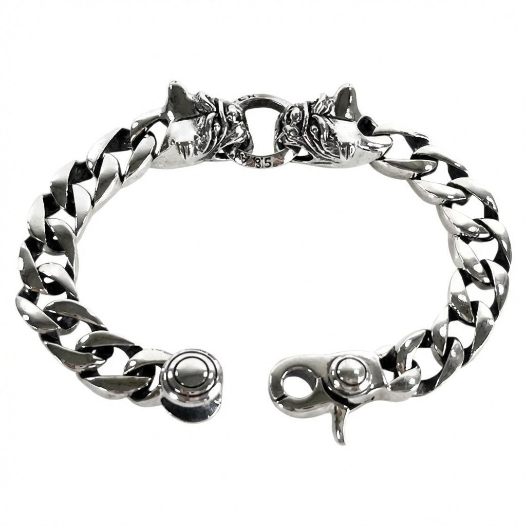 一位摯愛的好朋友,全天緊緊圍繞在你手腕上——這款小型鬥牛犬頭925純銀手鍊,是你收藏中獨特的配件。兩顆精緻的鬥牛犬頭爭奪著刻有雕紋的開口圓形吊飾。結合經典的Figaro鏈條,這件作品不僅適合日常配戴,也足夠時尚,適合重要場合。