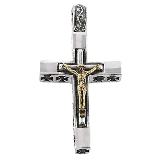 這款強而有力的墜飾以精緻的耶穌基督十字架像為核心。聖體採用華麗的鍍金工藝,與拋光銀面形成鮮明對比。這個象徵犧牲與救贖的終極符號,兩側鑲有一系列鐵十字細節,向重機騎士精神致敬;鐵十字作為備受尊崇的騎士十字標誌,代表榮譽與反叛。