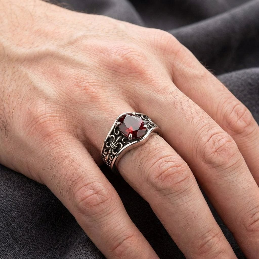以我們華麗的百合花石榴石戒指,喚醒古老貴族的力量。這不僅僅是一件飾品,更是一枚以純銀鑄造的皇家徽章,展現傳承與榮耀的宣言。戒指正面飾有法國皇室經典百合花標誌與深紅石榴石,專為自信如王者的男士而設。