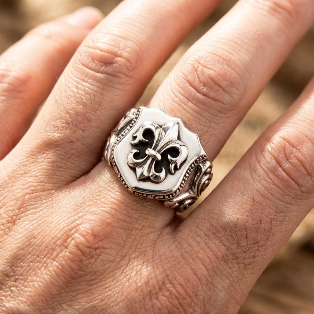 以這枚壯麗的百合花戒指,為你的手指增添力量、榮耀與高貴的永恆象徵。以一整塊 .925 純銀鍛造,向數世紀的皇室、榮譽與騎士精神致敬。這不僅是一件配飾,更是一段可穿戴的歷史——為現代騎士展現經典力量與高貴品格的宣言。