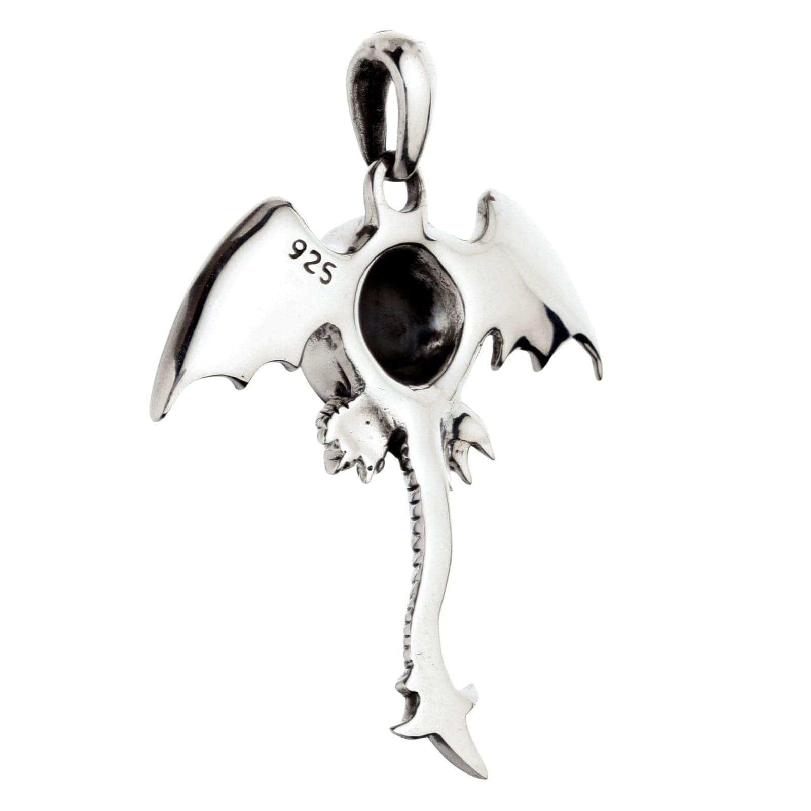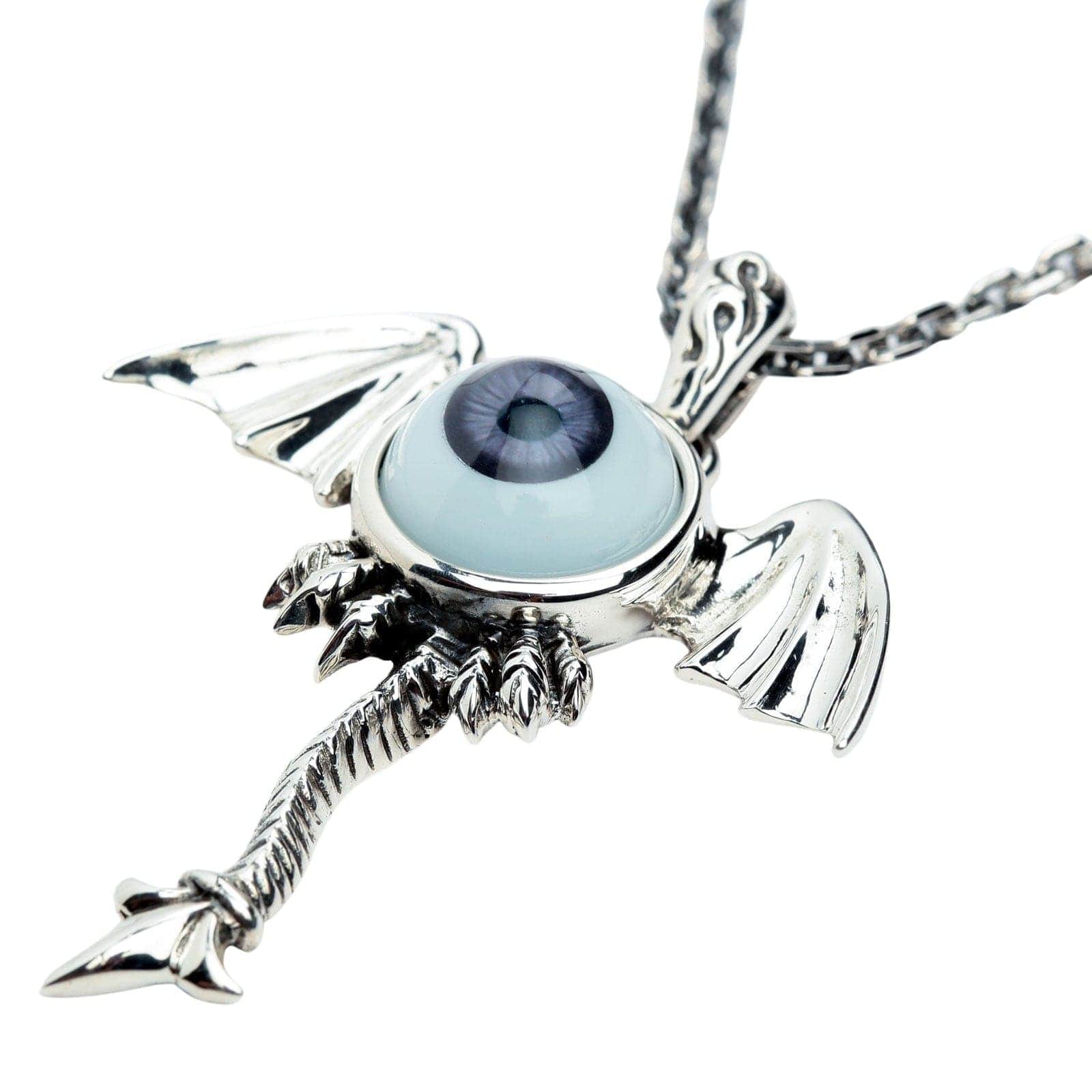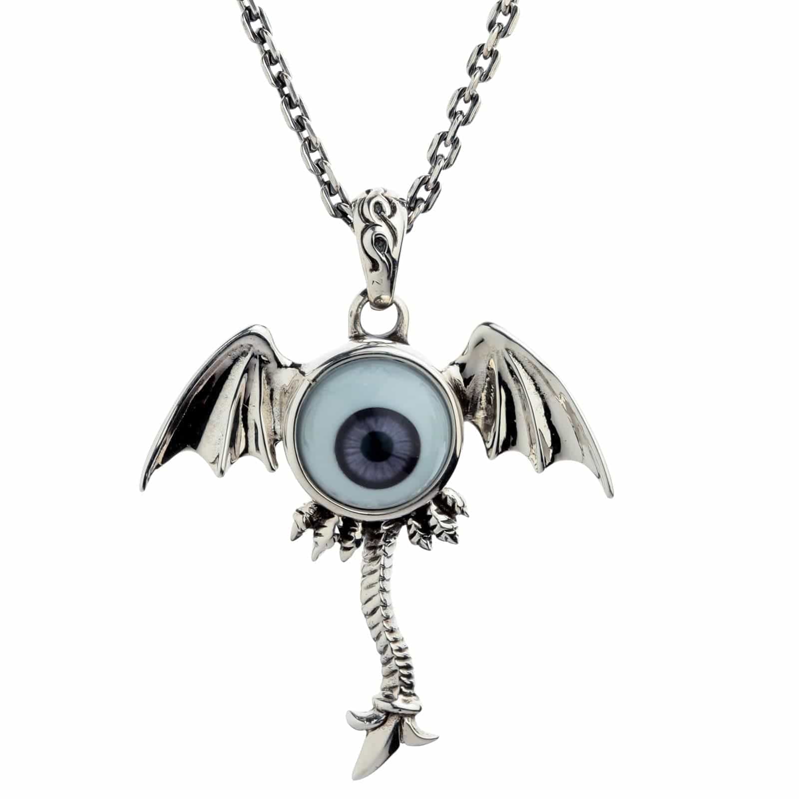 這款吊墜是對神秘傳說與超現實藝術的驚艷致敬。核心鑲嵌一顆迷人寫實的深紫色玻璃眼,深邃目光象徵王者權威與奧術魔法。這個全視之眼的強大象徵,由細緻皮質蝙蝠翅膀賦予飛翔,龍尾則成為堅實錨點。這獨特的混種神獸是守護祕密的現代神話生物。全件以23克純銀鑄造,拋光與氧化處理交錯,突顯每一處怪奇細節。可選配俐落2mm純銀鍊,其存在感與神秘目光同樣深刻。