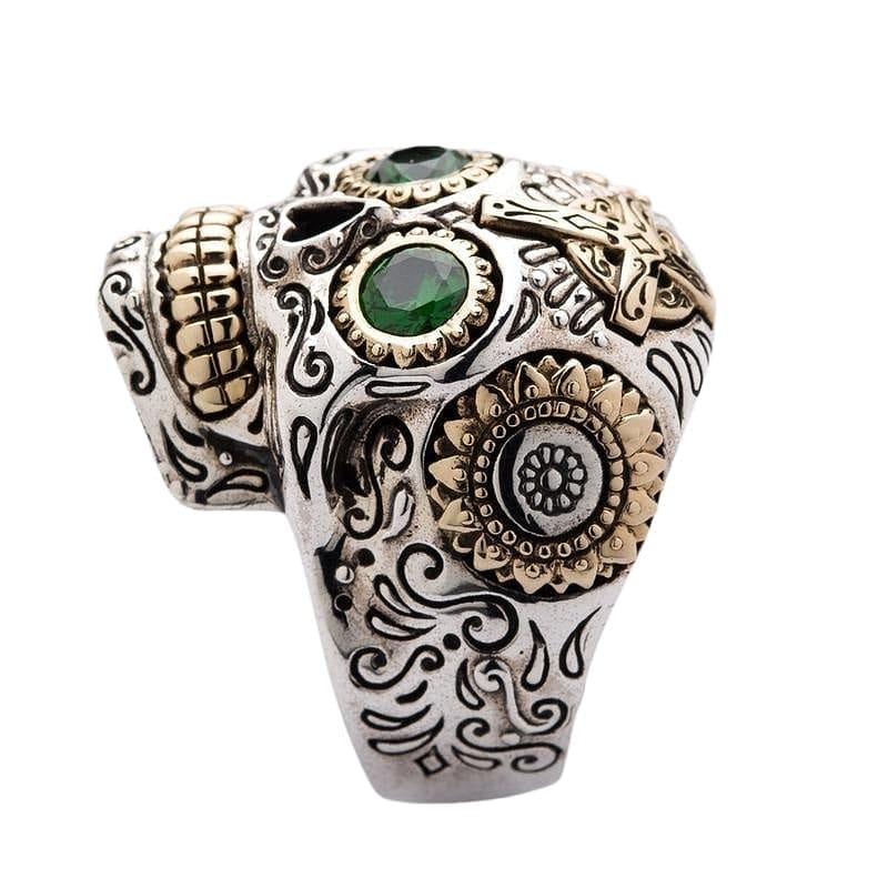 靈感來自墨西哥民俗藝術的傳統Calavera骷髏,這枚戒指是對生命無盡循環的華麗致敬。最引人注目的是閃耀的綠色CZ寶石雙眼,象徵生命、希望與重生。這些鮮明寶石被精緻細節環繞——從節慶花紋到額頭上的神聖十字架——全都以尊敬祖先的精神設計。我們工匠採用雙色工藝,在純銀糖骷髏戒指基底上疊加濃郁金黃黃銅點綴,強烈對比讓每一處雕刻細節都栩栩如生,打造出令人驚艷的可穿戴藝術品。