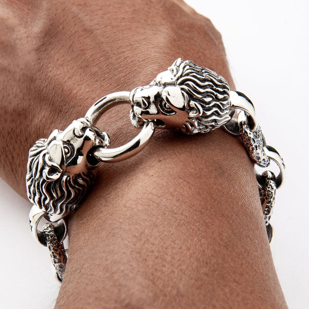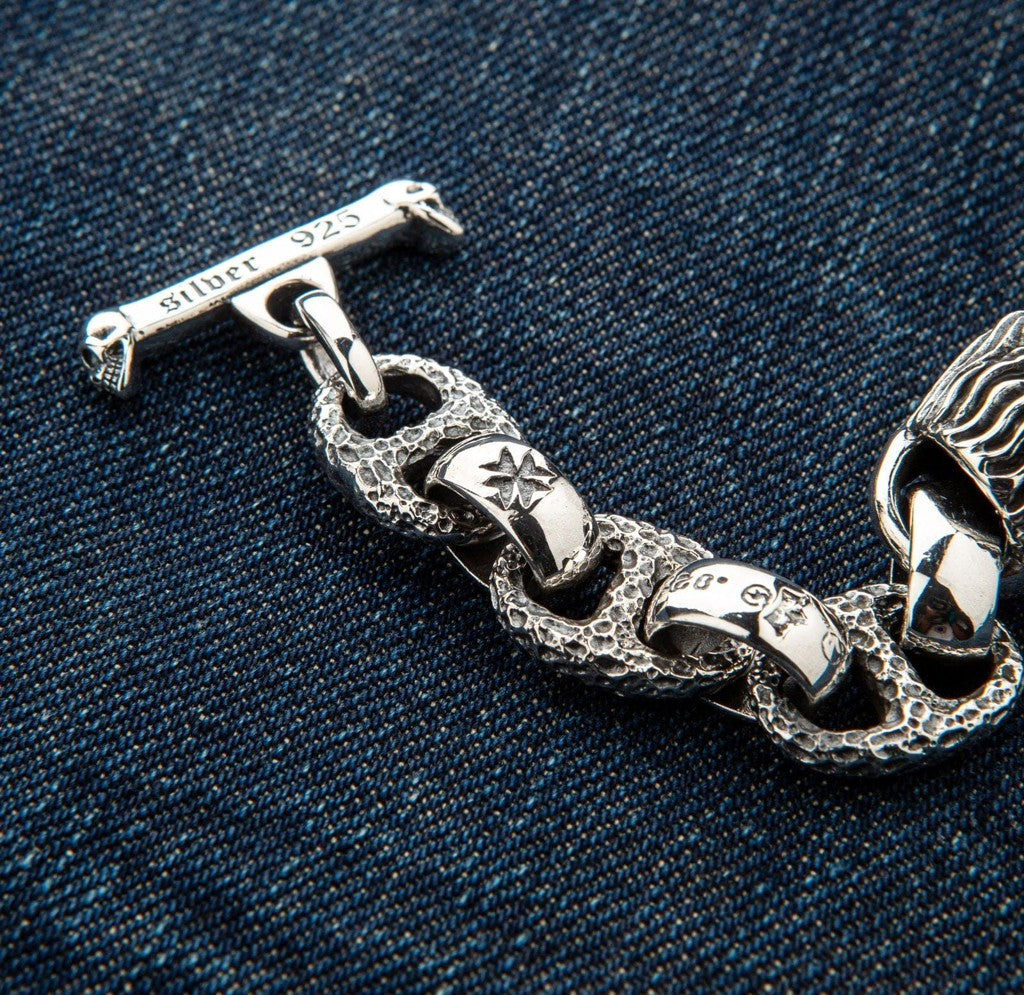 以我們的獅頭重磅純銀重機手鍊展現自信與風格。嚴選 925 純銀手工打造,兩端精雕細琢的獅頭象徵勇氣與領導力。堅固的銀質鏈節配以優雅雕花,完美體現重機與搖滾時尚精髓。安全 T 型扣設計,佩戴舒適,重量達 129 克,彰顯品質與奢華。無論作為獨特禮物或收藏珍品,皆為出眾之選。