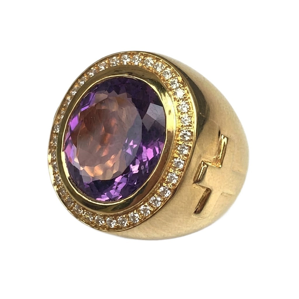 戴上這款華麗的紫水晶金主教戒指,踏入屬靈領袖的角色。這不僅僅是一件珠寶,更是權威與虔誠的深刻象徵,專為備受敬重之人而設計。其壯麗設計與深邃皇室紫色調,讓它成為一件值得最高聖職佩戴的教會藝術珍品。