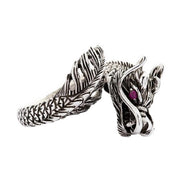這款戒指僅重 9 grams,是龍形系列中最輕盈的作品——一條盤旋的東方龍如藤蔓般纏繞指間,龍首昂揚於上,鑲嵌的兩顆紅色 CZ 寶石在光影下閃爍奪目。Japanese Dragon Wrap Ring 採用 .925 sterling silver 精製,佩戴感幾近於無。龍身自然貼合指節弧度,鱗片依循傳統 Ryū 風格雕刻——體態修長,蜿蜒無翼。