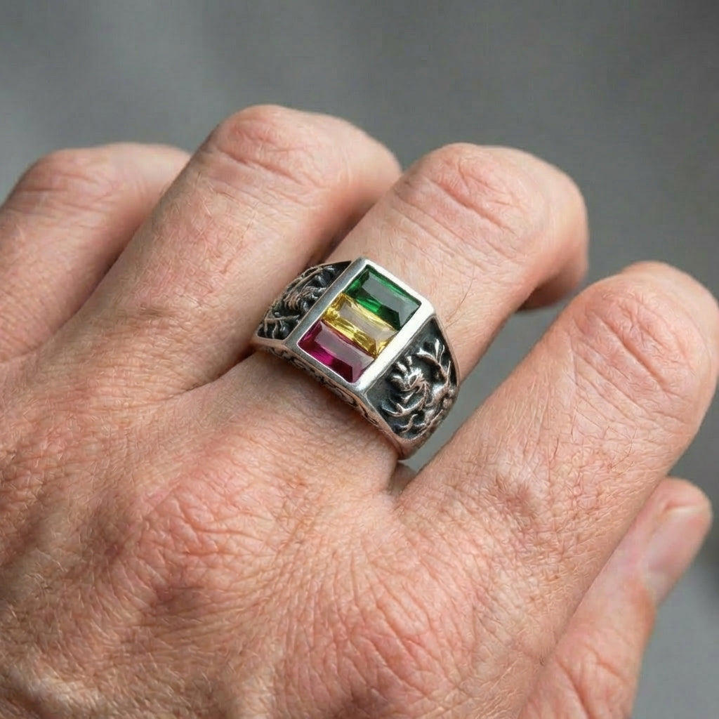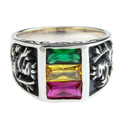 戒面驕傲地鑲嵌著三顆鮮明的梯形切割寶石,分別為綠、黃、紅三色。這正是衣索比亞國旗上具代表性的泛非色彩,在拉斯塔法里文化中各自蘊含深厚的精神意義:綠色象徵肥沃的應許之地,黃色代表財富與繁榮,紅色則是為自由而流的鮮血。如此繽紛的展現,讓它成為拉斯塔信仰者與愛好者的終極Rasta戒指。由我們技藝精湛的工匠手工打造,這件雷鬼飾品是任何男士戒指收藏中意義非凡的補充。