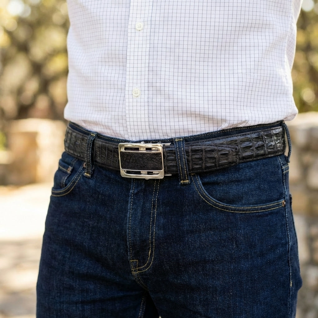 這條皮帶的靈魂在於其無與倫比的材質品質。採用真正的鱷魚背皮製成,以其堅韌、立體的紋理著稱,這種紋理來自爬蟲類脊椎上獨特的骨板。這天然的護甲不僅視覺上引人注目,更極為耐用。深邃閃亮的黑色表面賦予它百搭的優雅,無論是搭配西裝還是設計師牛仔褲都同樣出色。功能與奢華兼備的銀色自動鎖扣,採用現代軌道式設計,可精細微調,讓每一次佩戴都完美貼合,且無傳統皮帶孔的磨損問題。從手工鞣製到精緻縫線,每一寸細節都彰顯匠師的高超技藝。