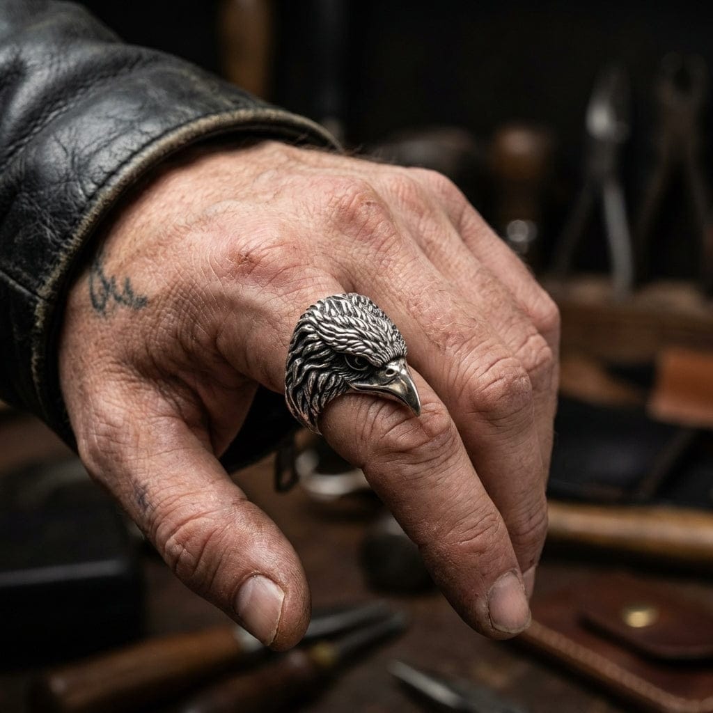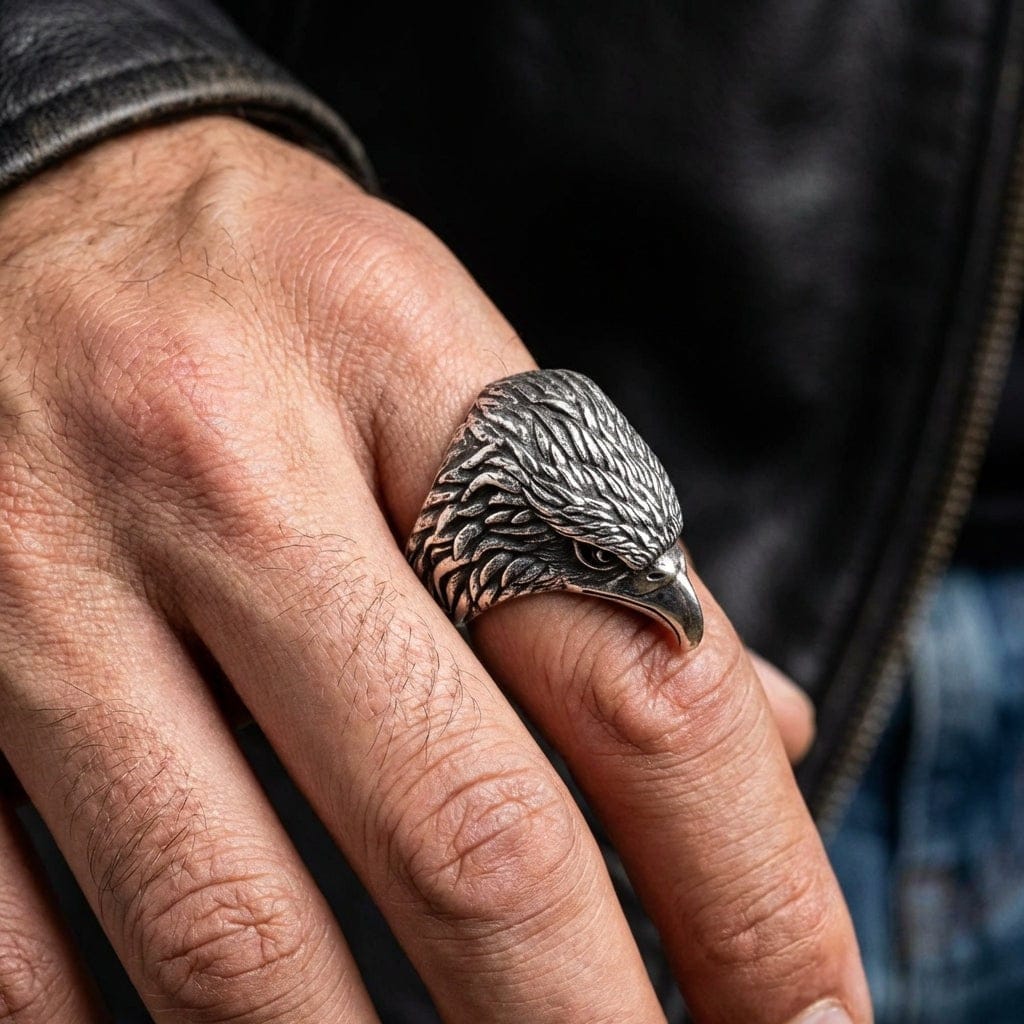 問:這款戒指適合重機騎士或退伍軍人嗎? 答:當然適合。老鷹是重機文化中最受尊崇的象徵,也是美國愛國主義的強力標誌。這讓我們的男士老鷹戒指成為送給任何重機騎士、退伍軍人或重視自由、力量與專注的愛國者的極具意義禮物。