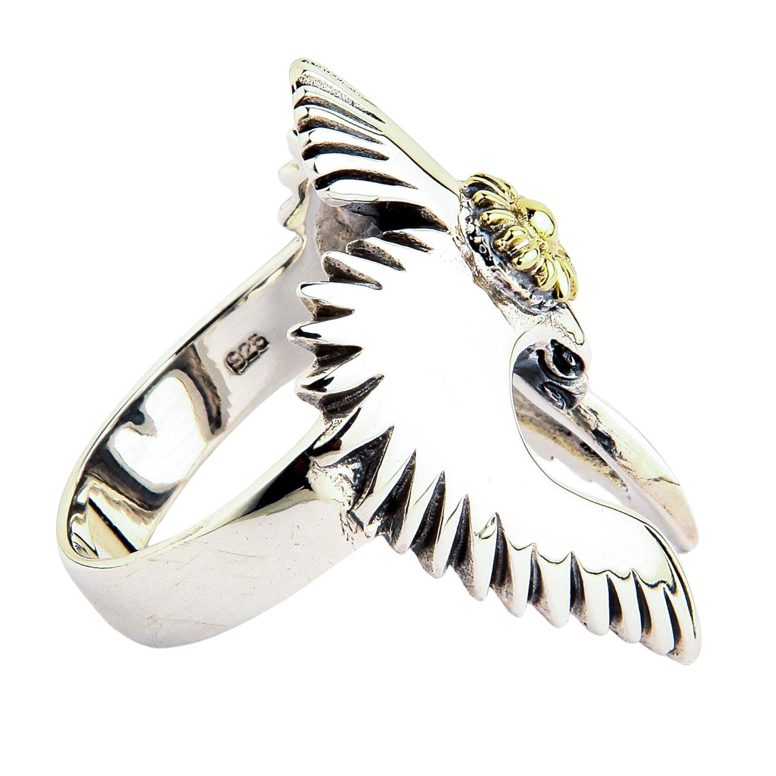這枚戒指以精湛工藝呈現出老鷹的造型,展翅欲飛,強而有力的雙翼如同飛翔中環抱手指,帶來守護與優雅的擁抱。每根羽毛都細緻雕琢,亮銀與深色氧化線條交織出層次與動感。老鷹背上鑲嵌著金色太陽符號,象徵生命能量與療癒力,營造出搶眼的雙色焦點,令人目不轉睛。