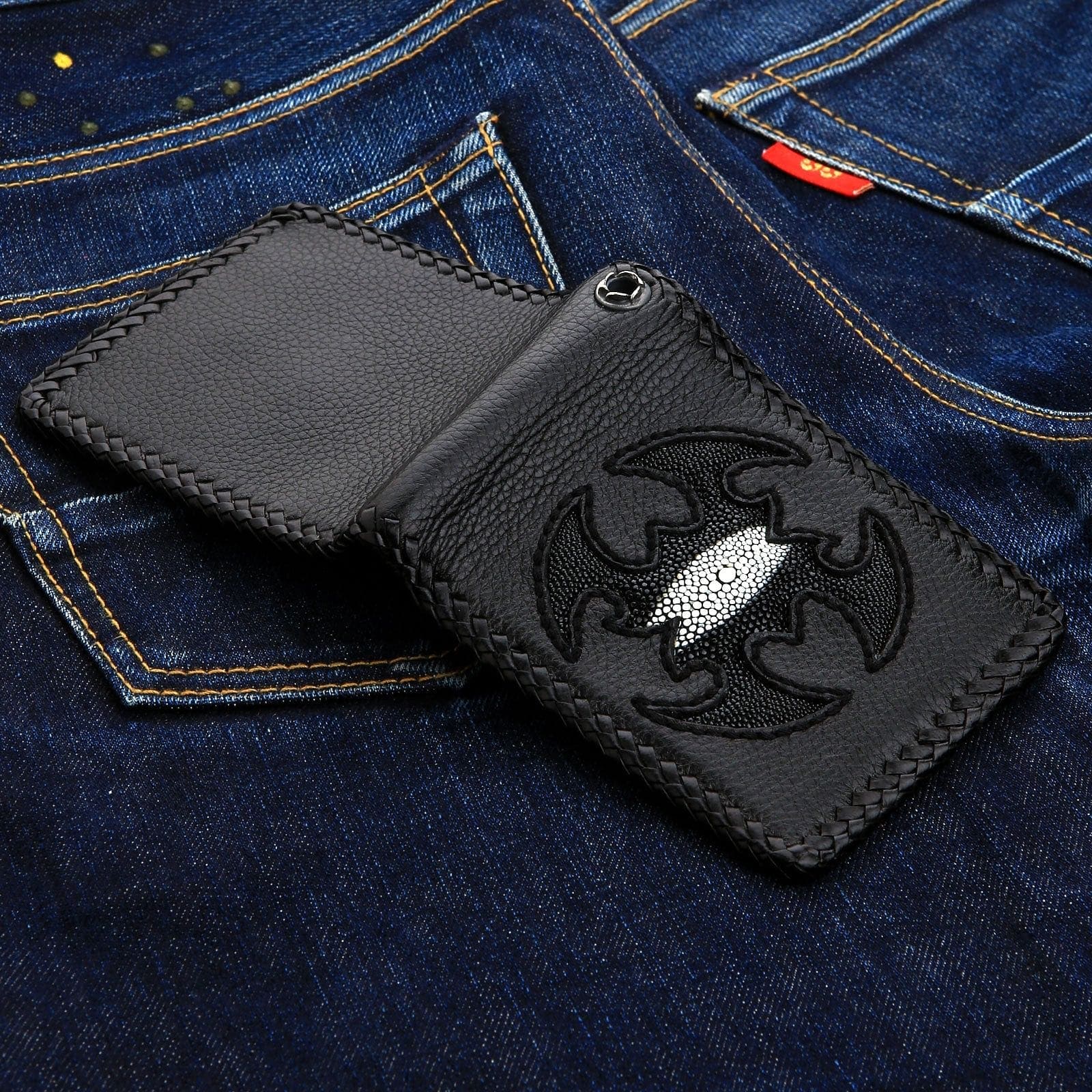問:魟魚皮適合做錢包嗎? 答:絕對適合。魟魚皮,又稱珍珠魚皮,是世界上最堅韌耐用的皮革之一。其獨特、富含鈣質的顆粒紋理極耐刮傷、磨損與防水,非常適合用來製作耐用的重機鍊錢包。
