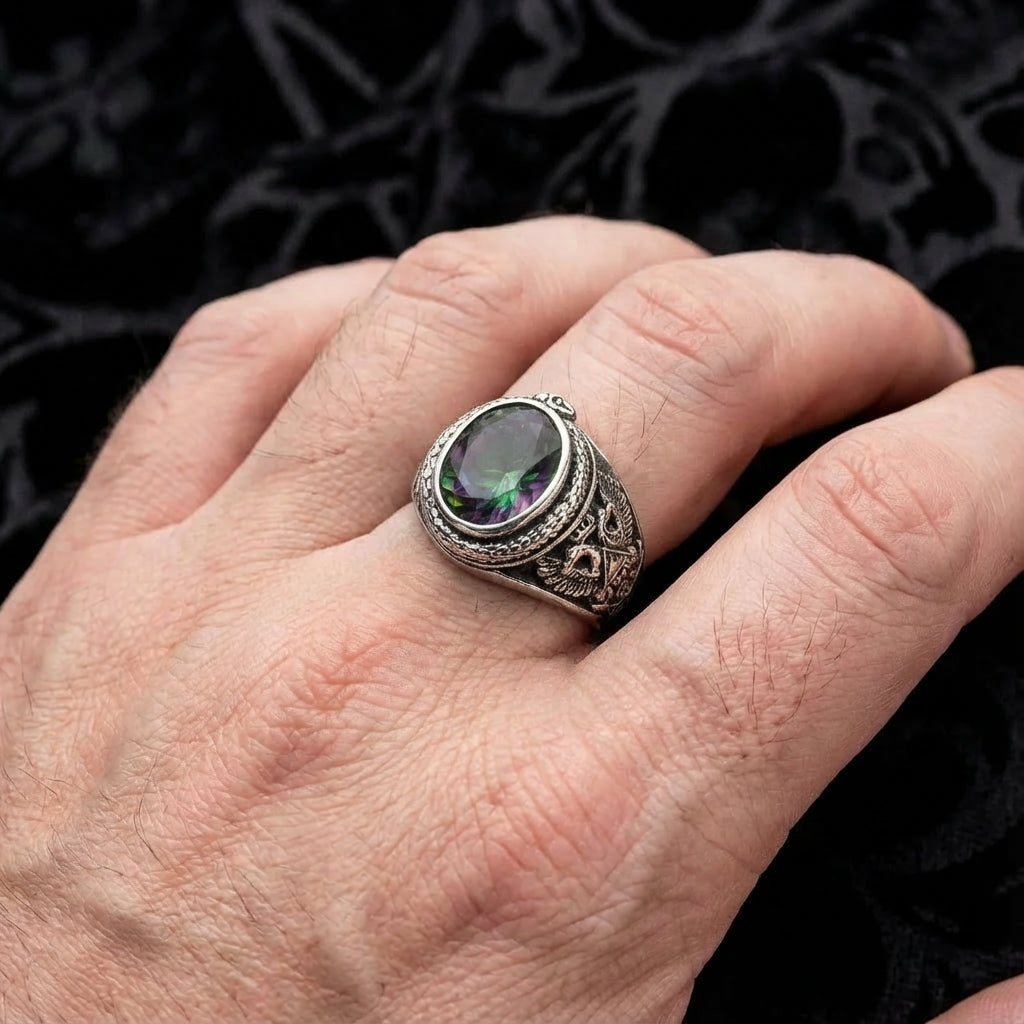 中央閃耀的變色神秘托帕石象徵啟迪與隱藏的智慧,鑲嵌於獨特的吞尾蛇(Ouroboros)戒台中,這是永恆與重生的古老符號。作為共濟會珠寶的傑作,這款戒指具傳家價值,適合每位兄弟自豪佩戴。