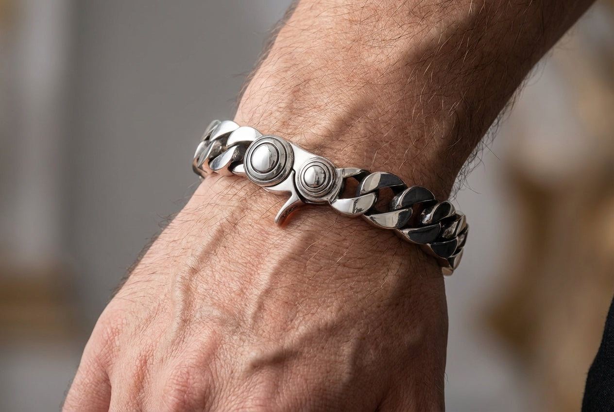 以我們精緻的925純銀粗鍊男士手鍊提升您的時尚品味。嚴選頂級.925純銀手工打造,經典粗鍊設計展現力量與優雅。97克的厚實但舒適重量,16毫米(0.6吋)寬的鍊節,無論日常或正式場合都極具存在感。每條手鍊皆由工匠細心鑄造與拋光,展現卓越手藝,確保獨特風格與耐久品質。堅固安全的扣環上刻有.925標誌,保證真品與高品質。不論搭配休閒或正式服裝,這款俐落手鍊皆展現多變風格與高雅氣質,是任何珠寶收藏不可或缺的配件。