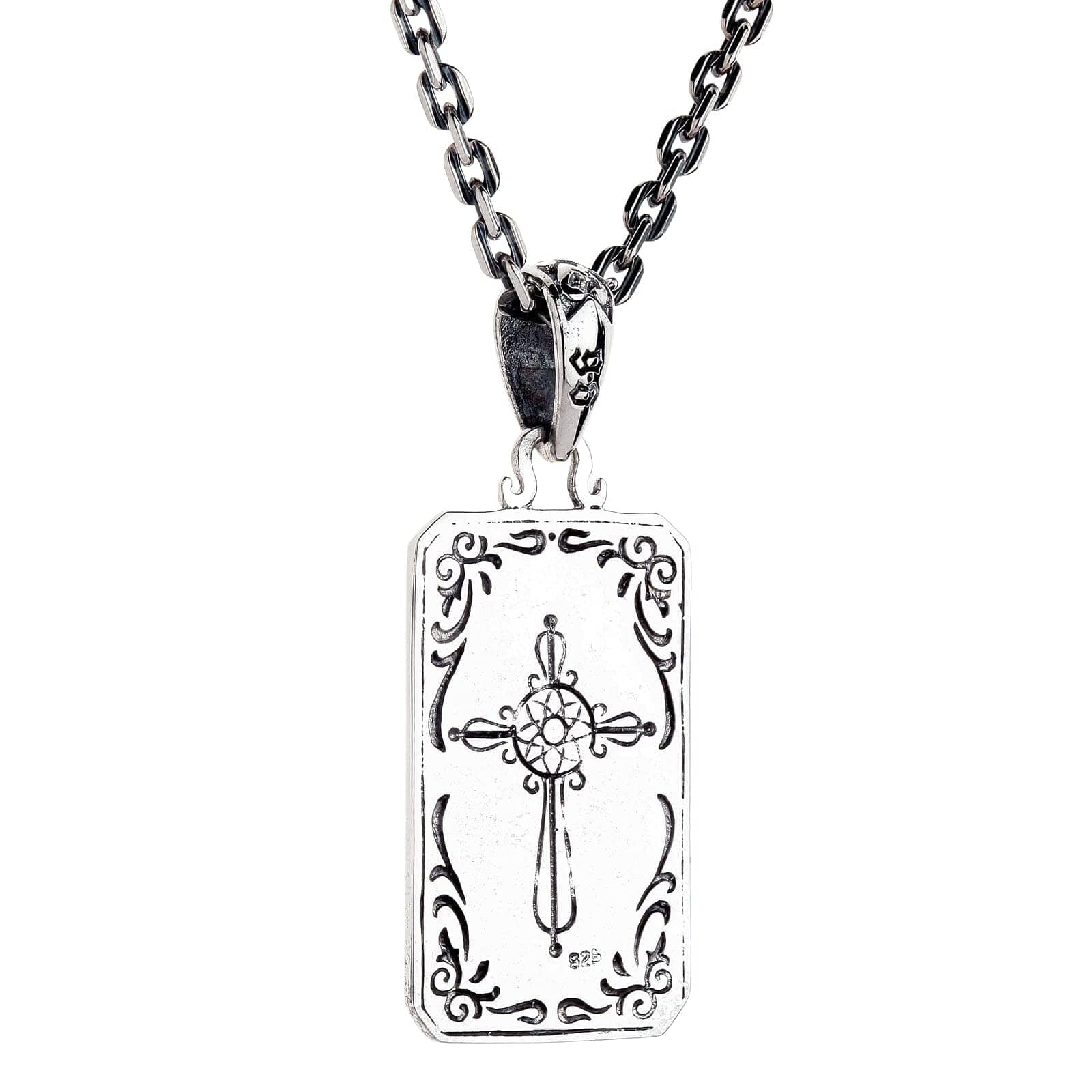 但真正的魔力在於它的多變性。這是一款雙面墜飾。翻到另一面,即可見優雅十足的太陽核心十字架,被華麗的哥德式渦紋環繞。一件飾品,兩種風格——戴上隱者象徵自我探索,或選擇十字架帶來守護。連吊環本身也是藝術品,成就這件獨特的神秘飾品。