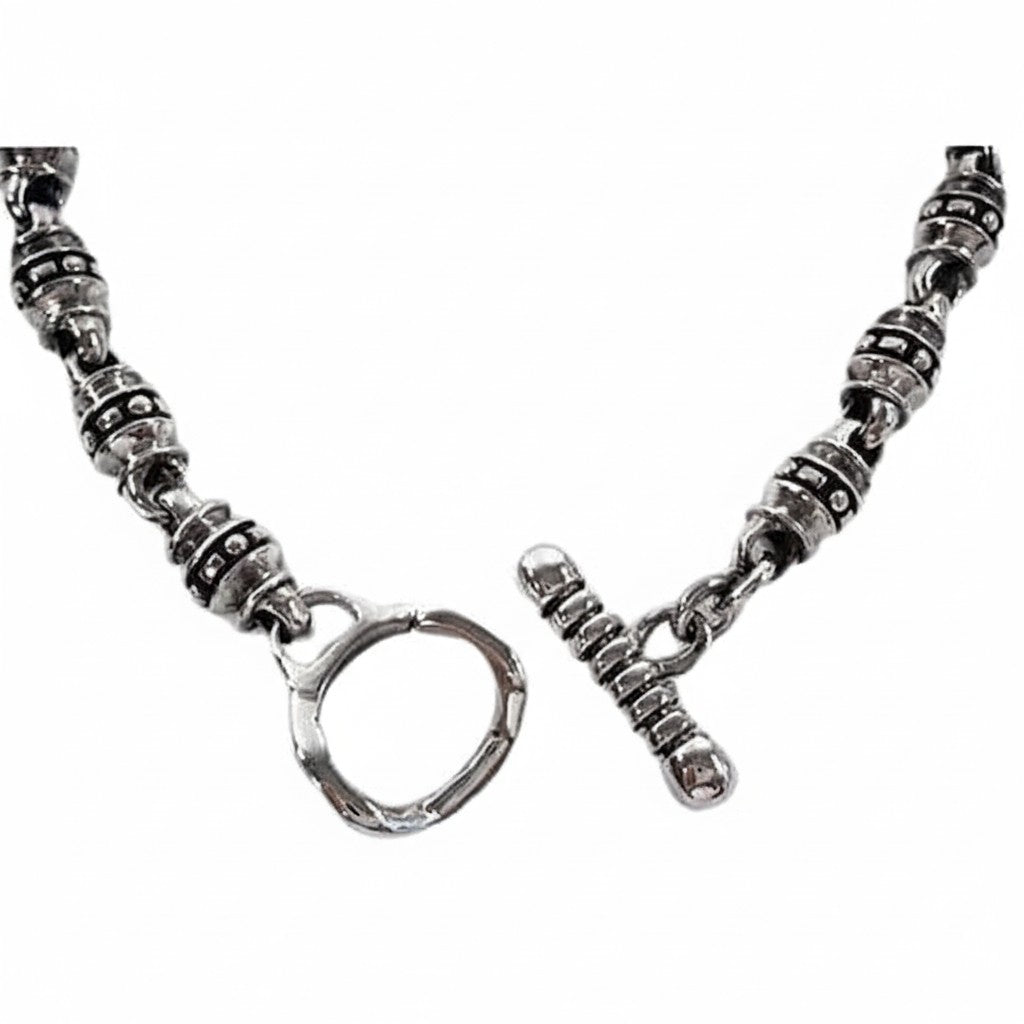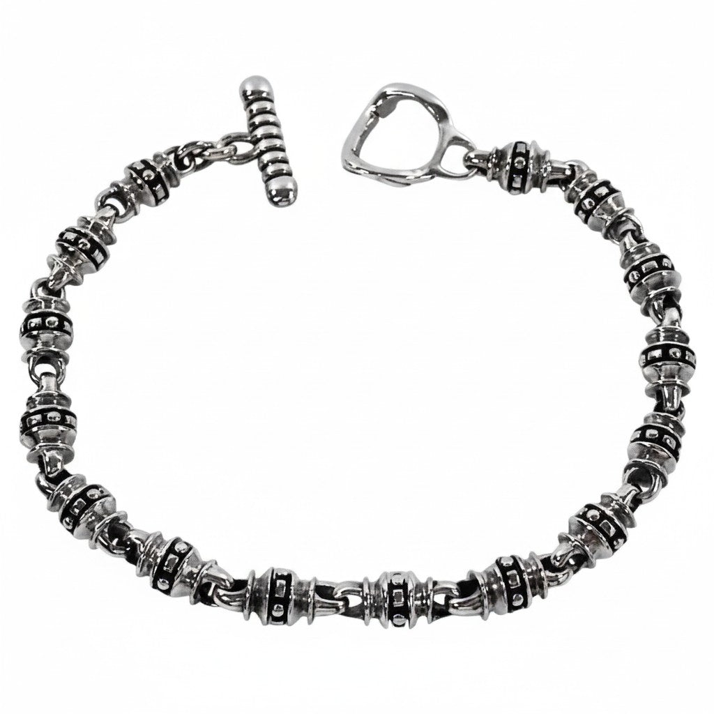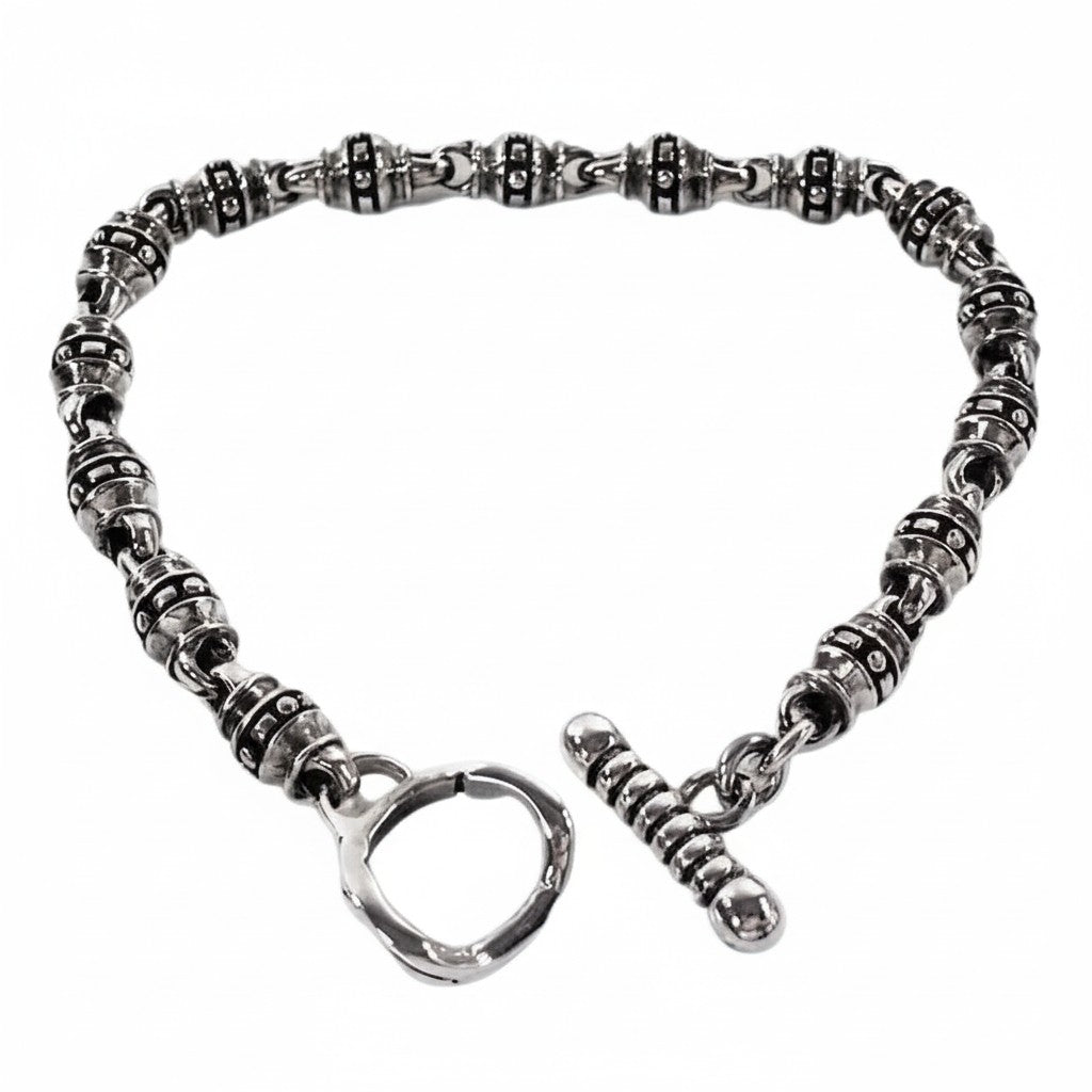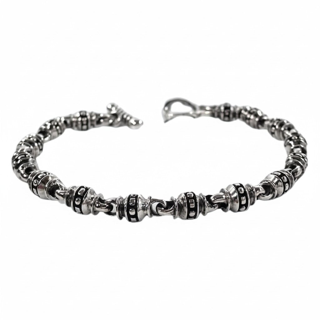 這款男士部落風格手鍊的每一個鏈節都展現了精湛的工藝。「滾筒」珠飾細節繁複,深邃的氧化部落雕刻與高拋光銀面形成強烈對比。這款粗獷設計不僅僅是美感,更喚起古老象徵與叛逆精神,是部落風珠寶的絕佳選擇。