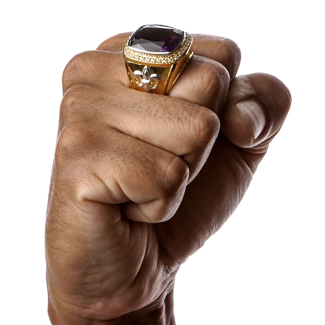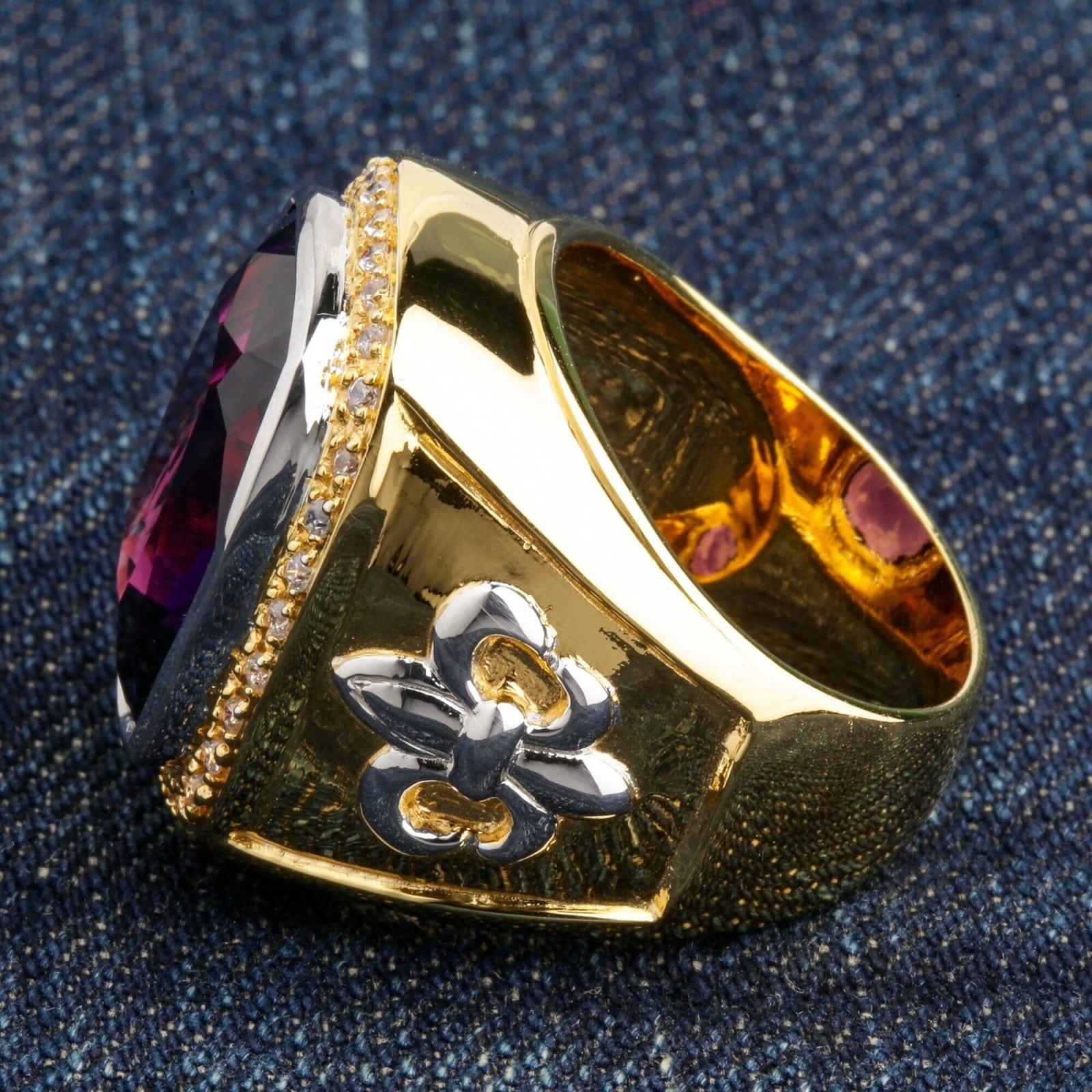 金色戒環兩側鑲嵌拋光銀色百合花(Fleur-de-lis),這是聖三一及皇室的永恆象徵。這枚百合花戒指完美融合深厚的宗教意義與高貴力量設計。作為我們主教珠寶系列的鎮館之寶,這款精緻的男士紫水晶戒指具備傳家寶級品質,值得珍藏一生。